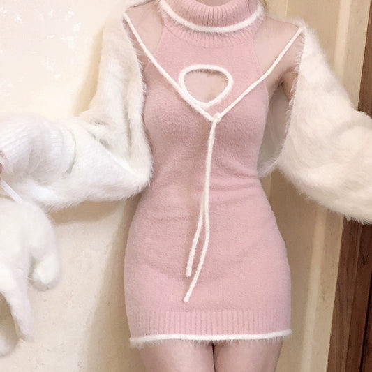 Imitation mink fur soft pink handmade fur ball cat ear hat scarf