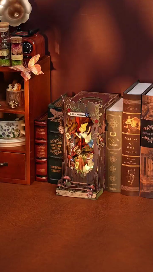 Alice falls into Wonderland, book stands, DIY hut assembles handmade building blocks