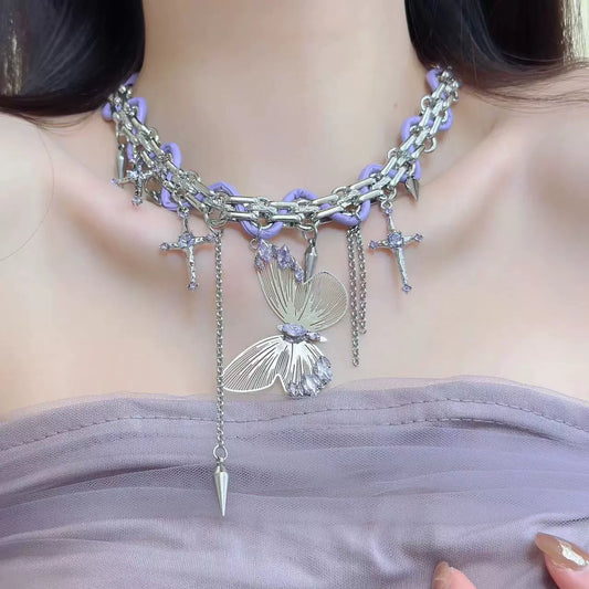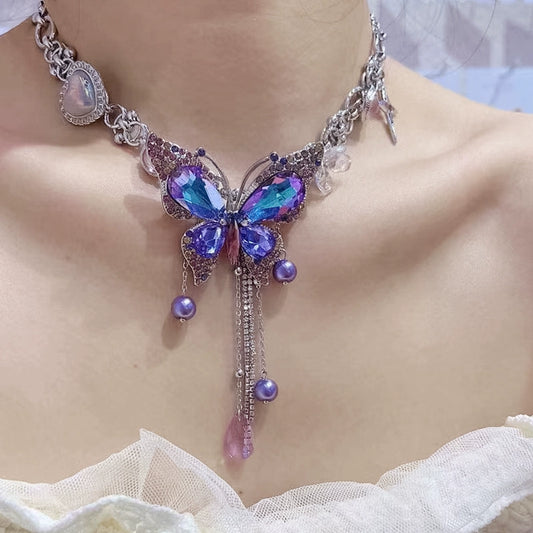 Y2K Blue Purple Sparkling Zircon Butterfly Necklace