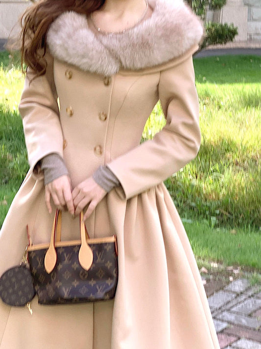 Beige Faux Fur Collar Flared Maxi Princess Coat
