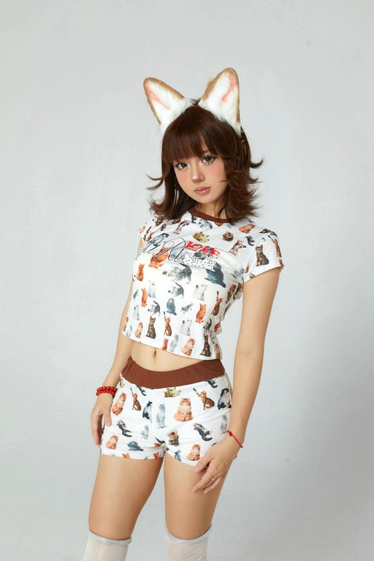 Full print of cute kitten short-sleeved shorts suit