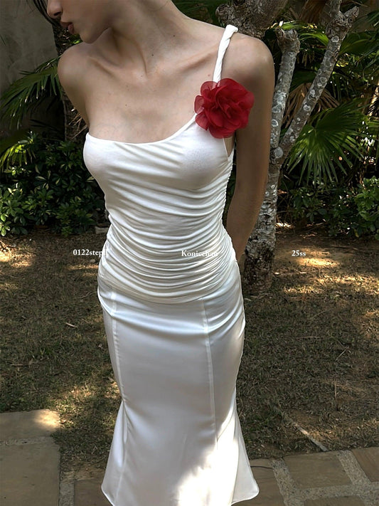 White slanted shoulder pleated suspender fishtail skirt set