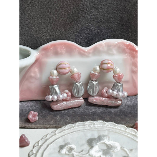 ~Ningfu Flower Basket~Light Pink Pearl Handle Three Dimensional Lily Flower Basket Shaped Earrings