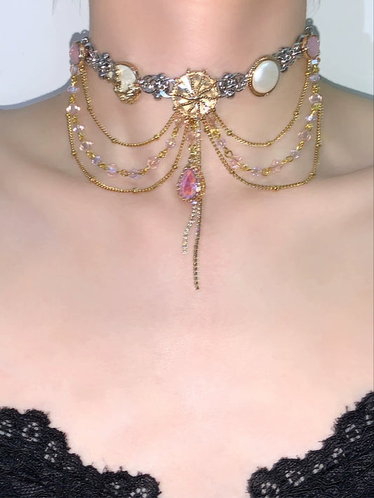 Barbie Jenny Pink Diamond Flower Pearl Tassel Titanium Steel Necklace