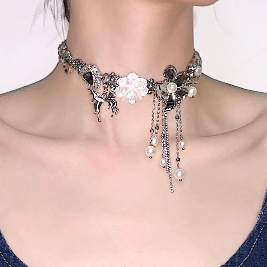 Broken Dream Butterfly Titanium Steel Necklace Flower Pearl tassel