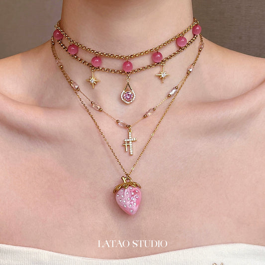JUICY Pink Strawberry Flower Sea Pearl Colored Titanium Steel Necklace