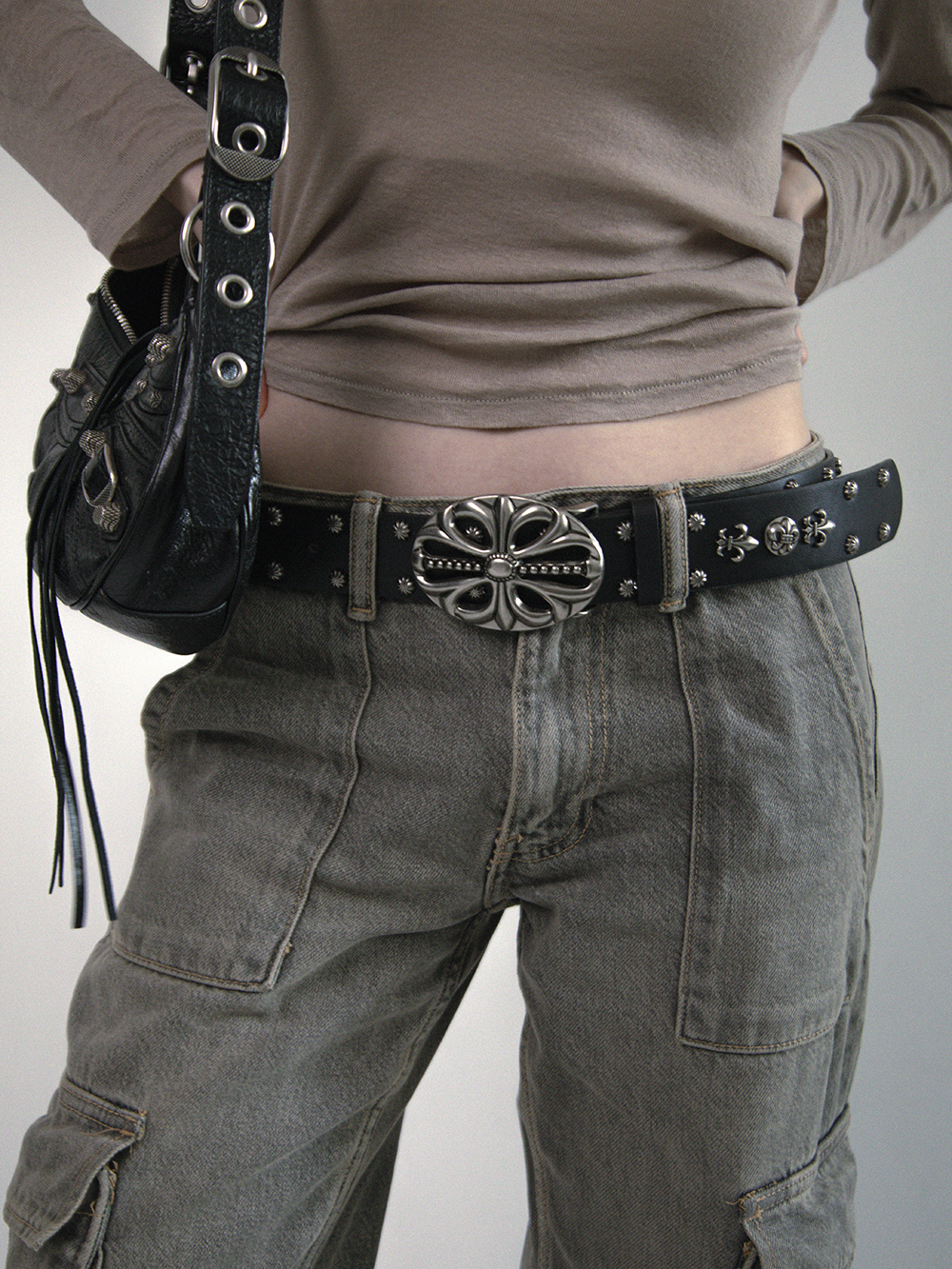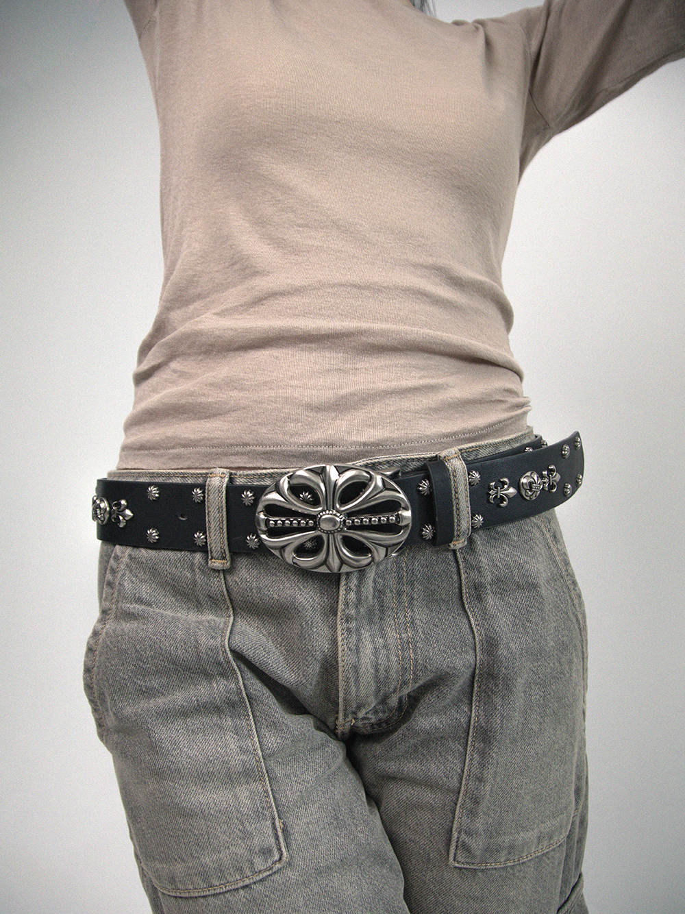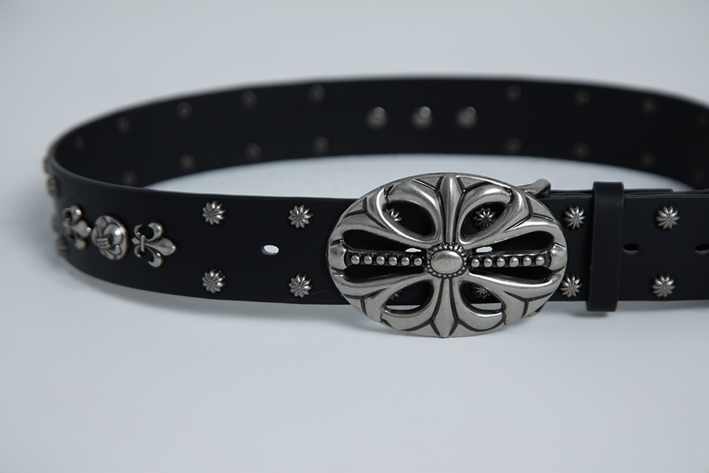 Antique silver cross carved rivet punk black belt
