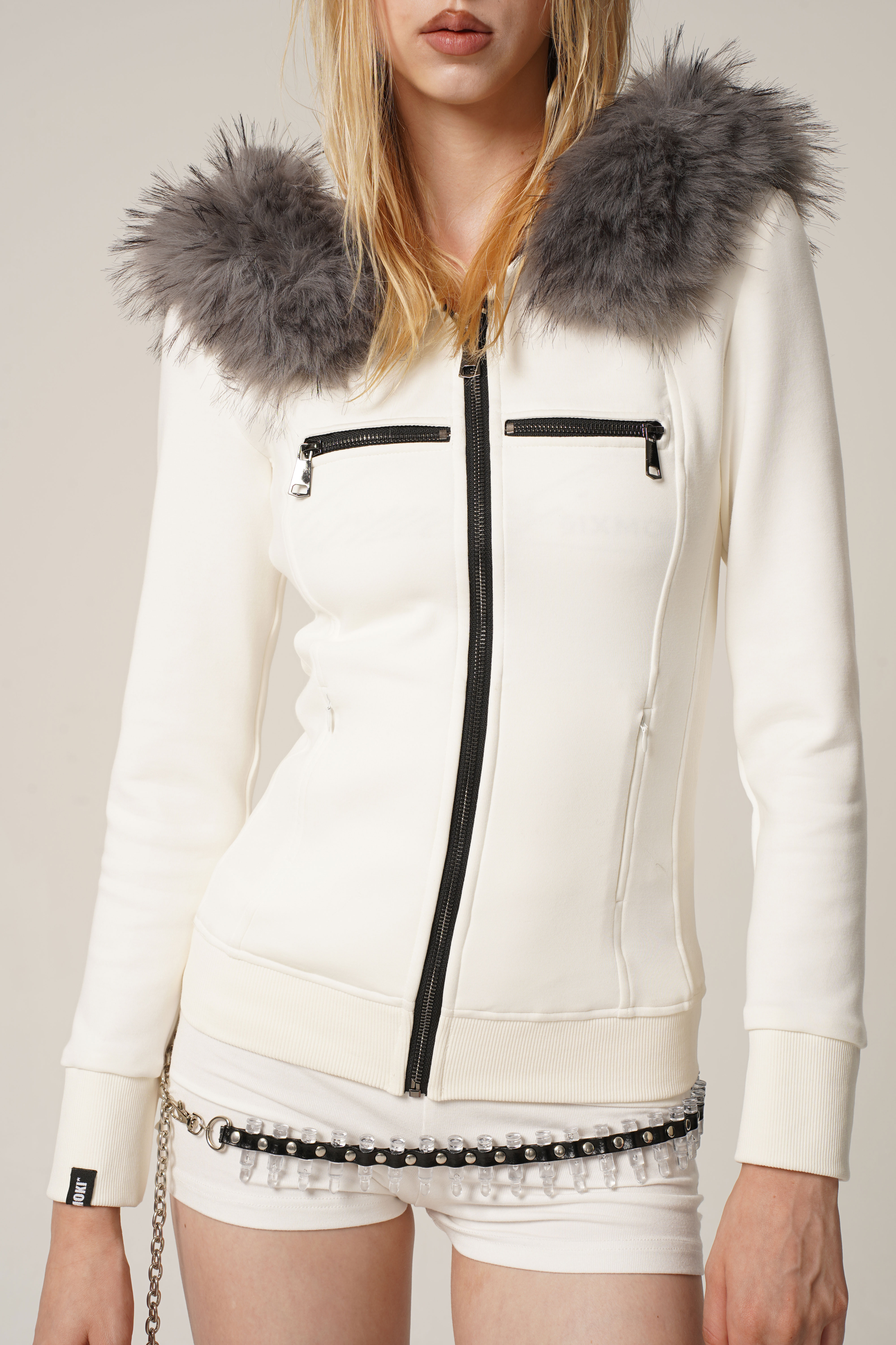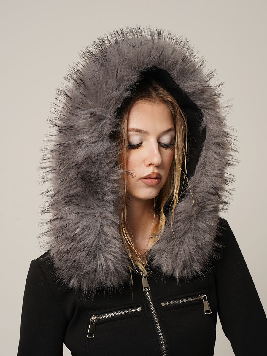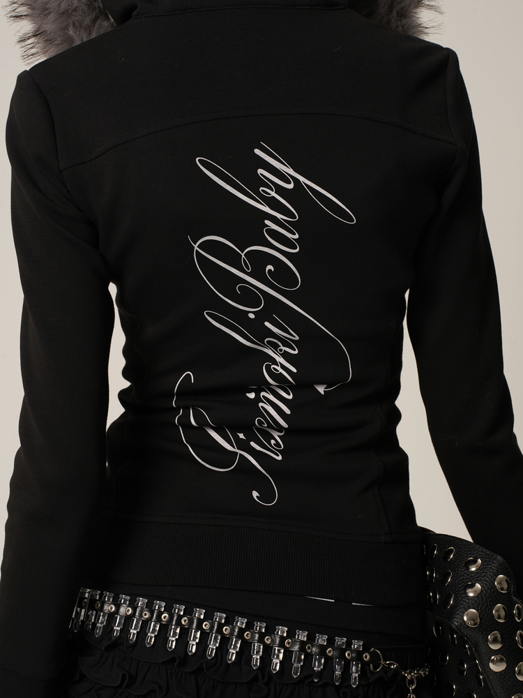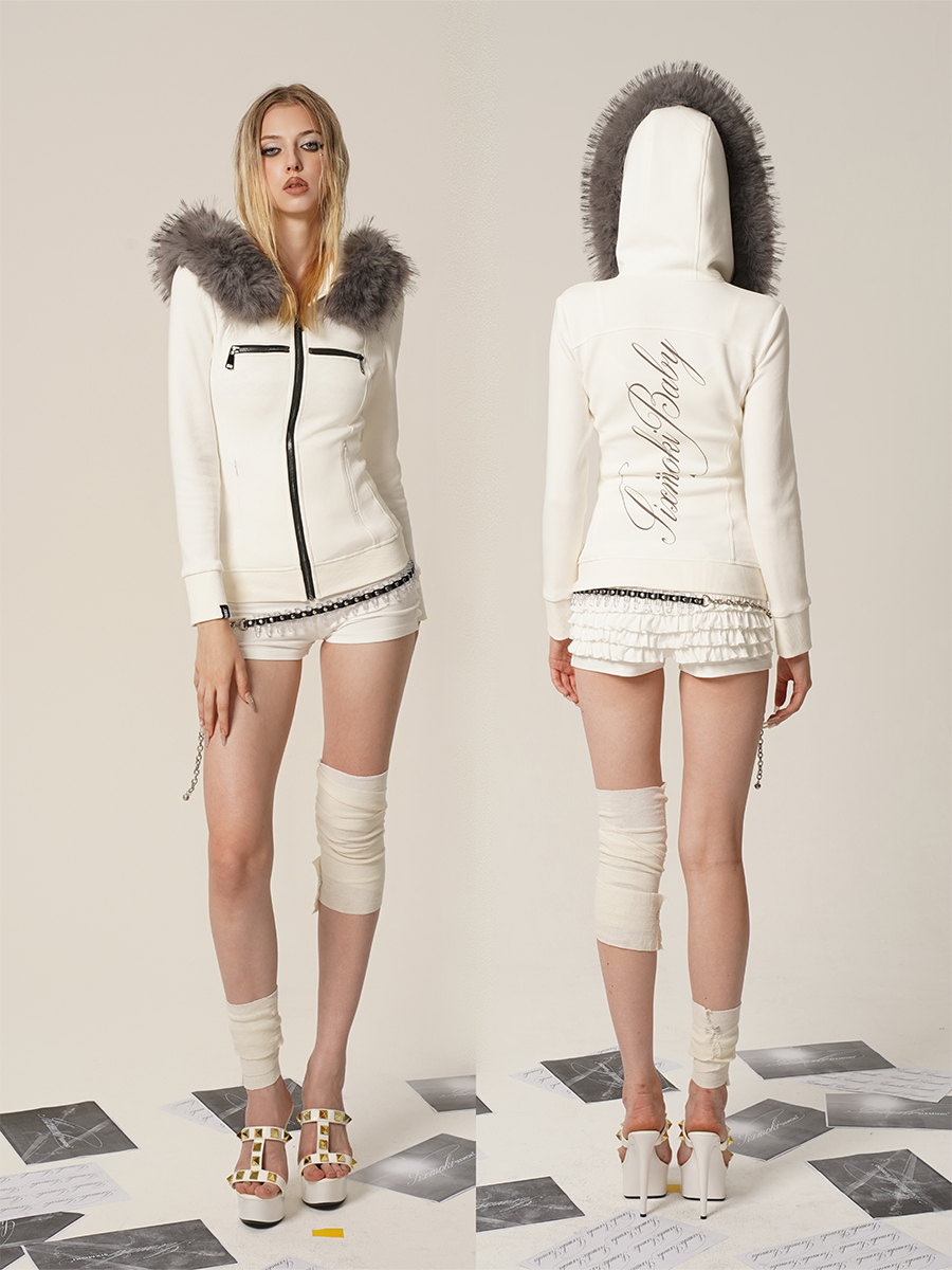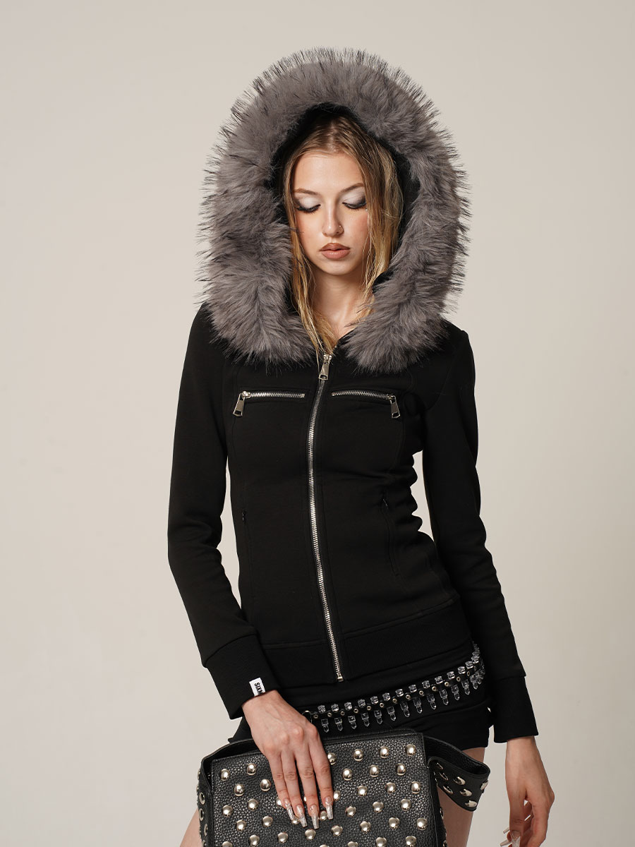 Black and white hoodie jacket with detachable fur collar