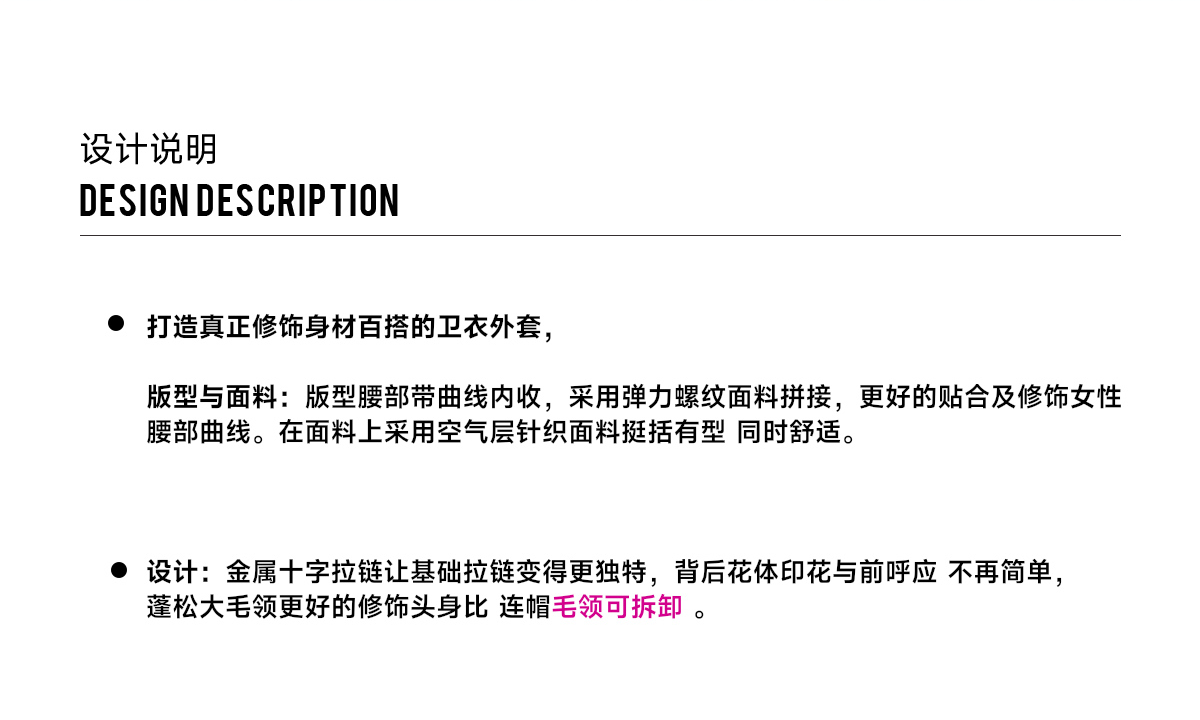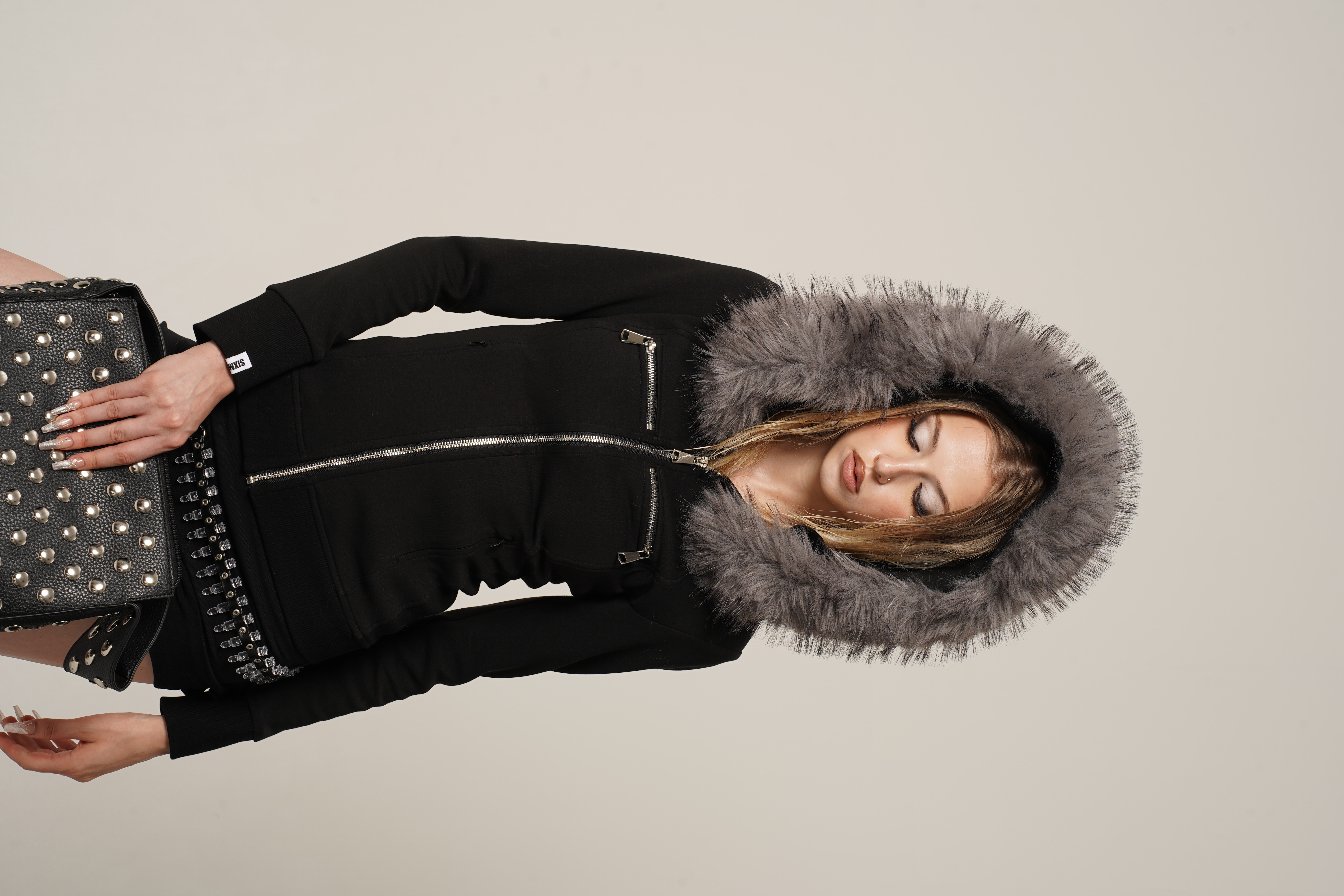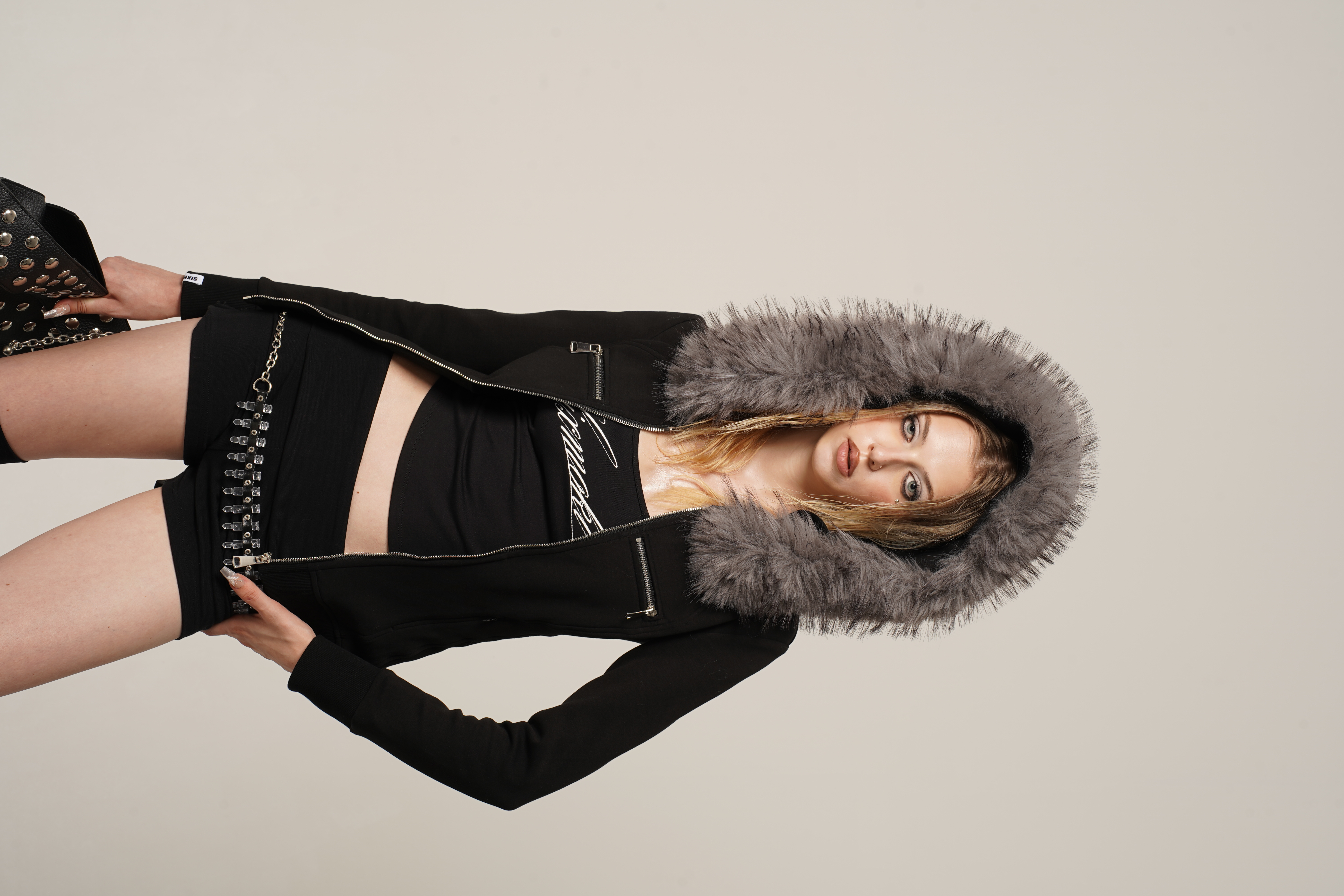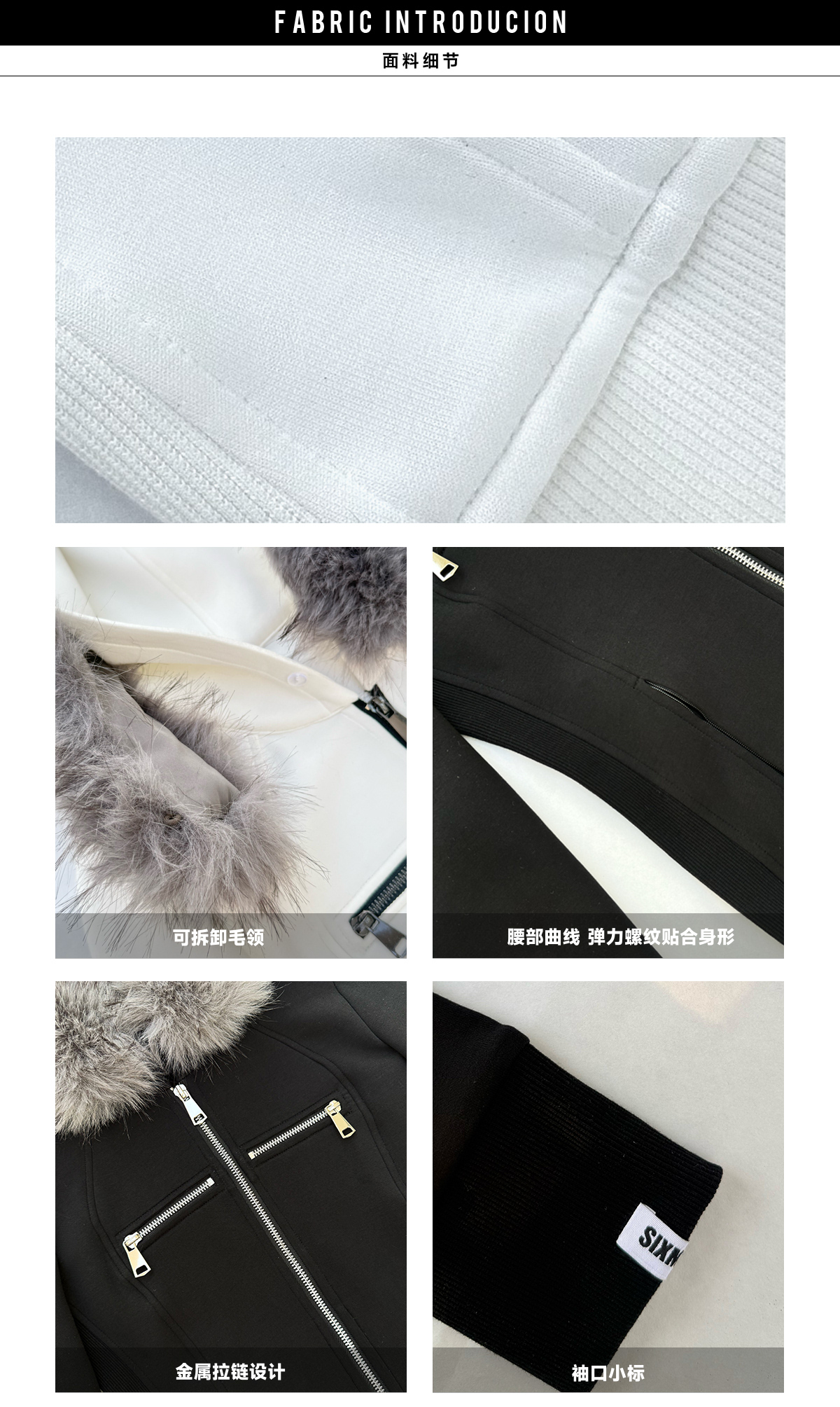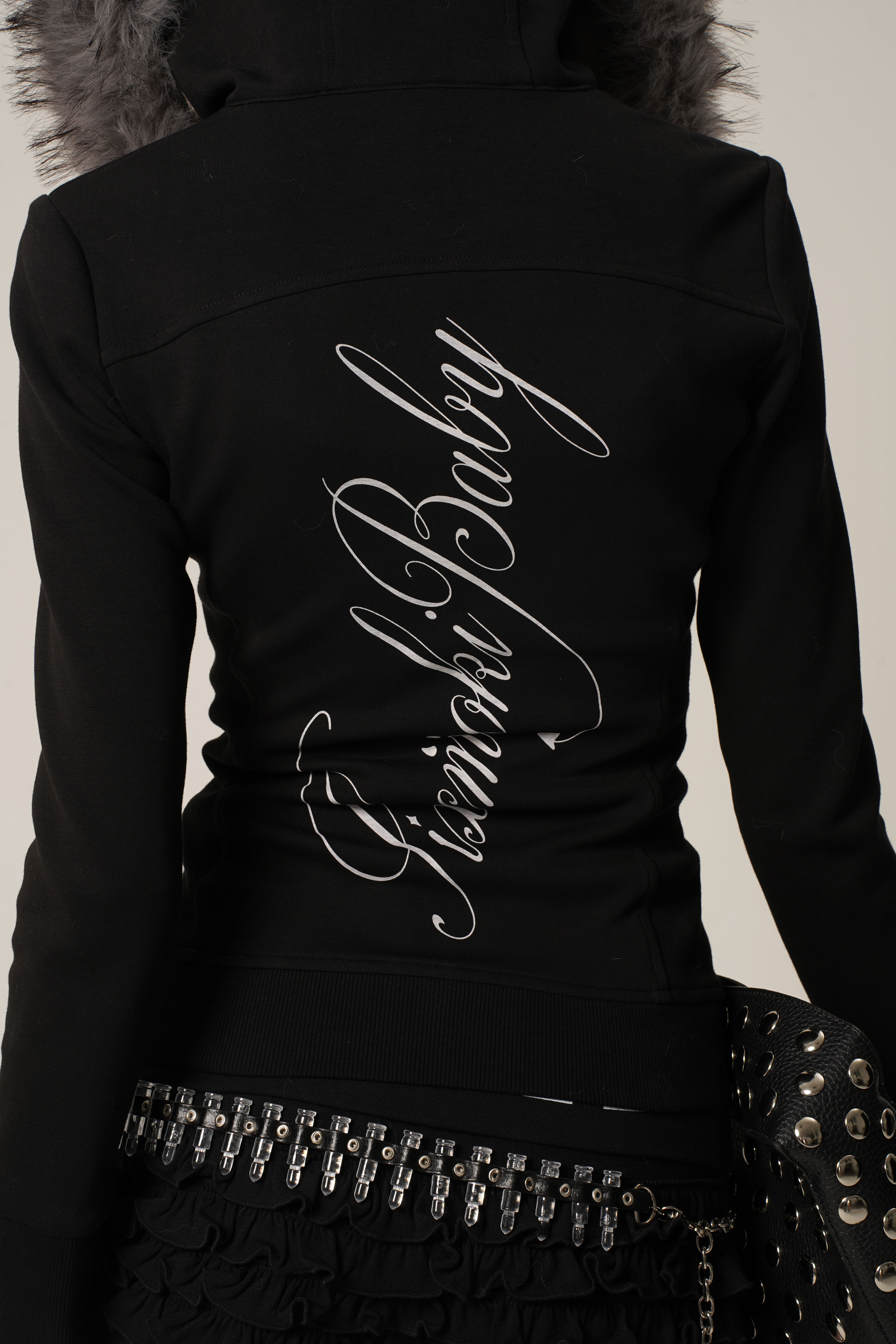 Black and white hoodie jacket with detachable fur collar