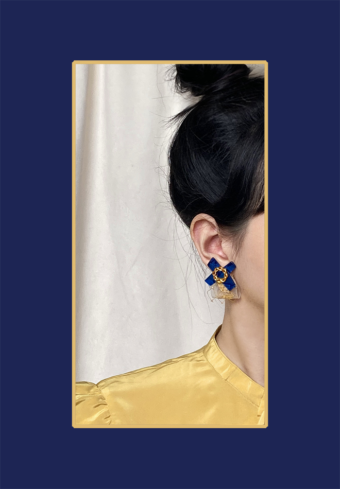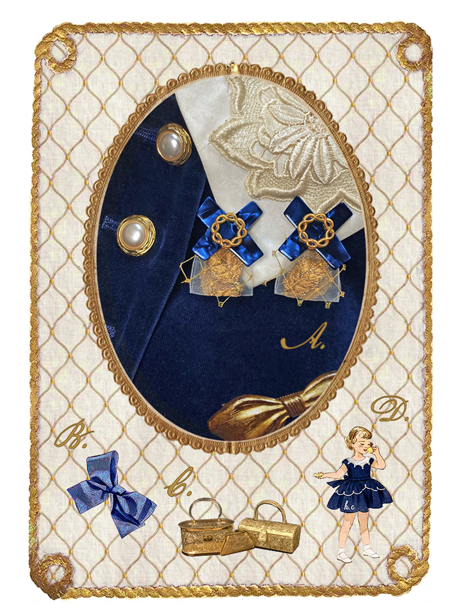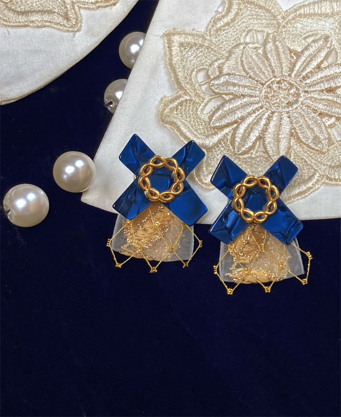 Gemstone Kiss xoxo "Pearl Blue Silk Gold Leaf Embroidered Ribbon Bow Earrings Classical and Gorgeous