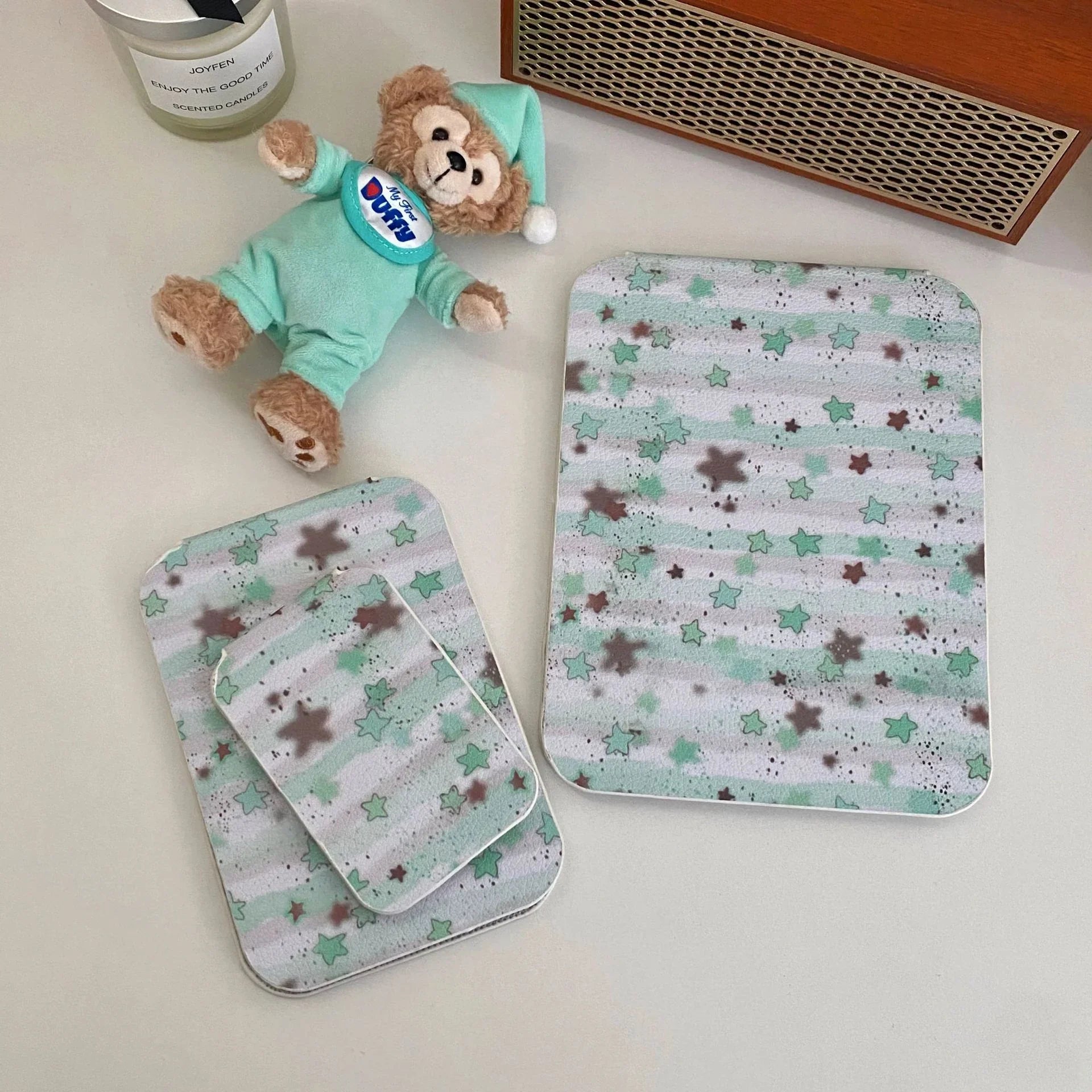 colour: Black background with blue floral patterns