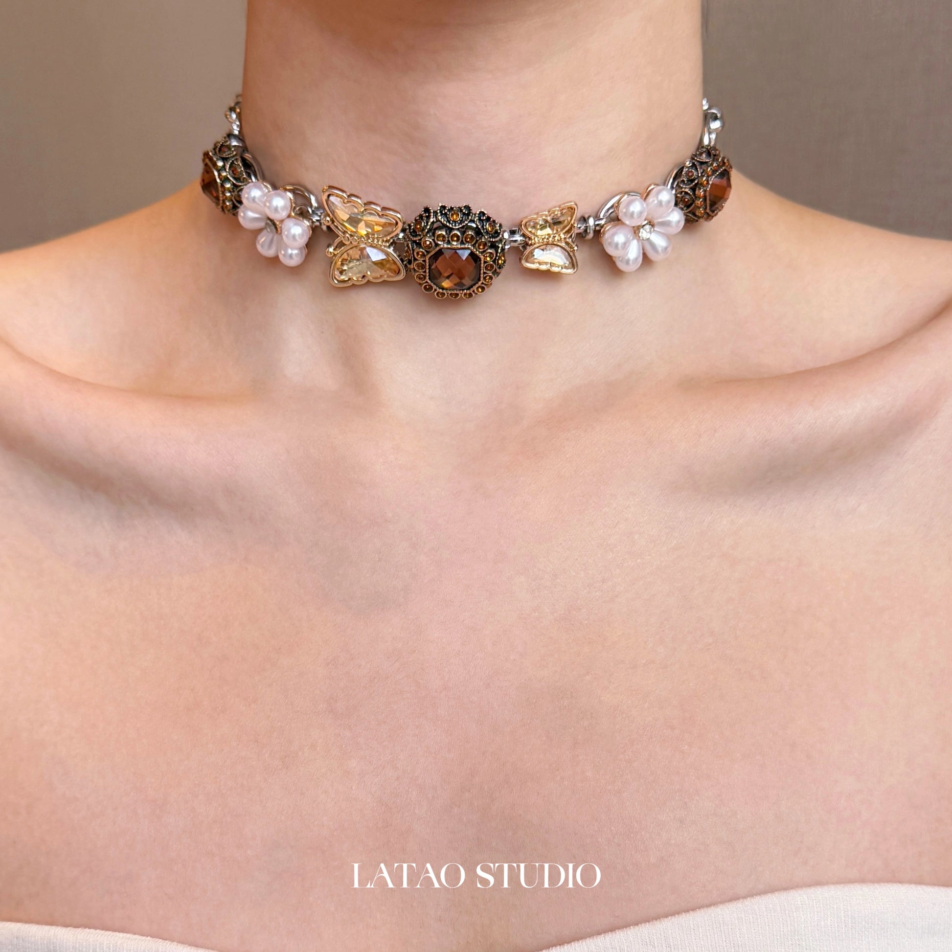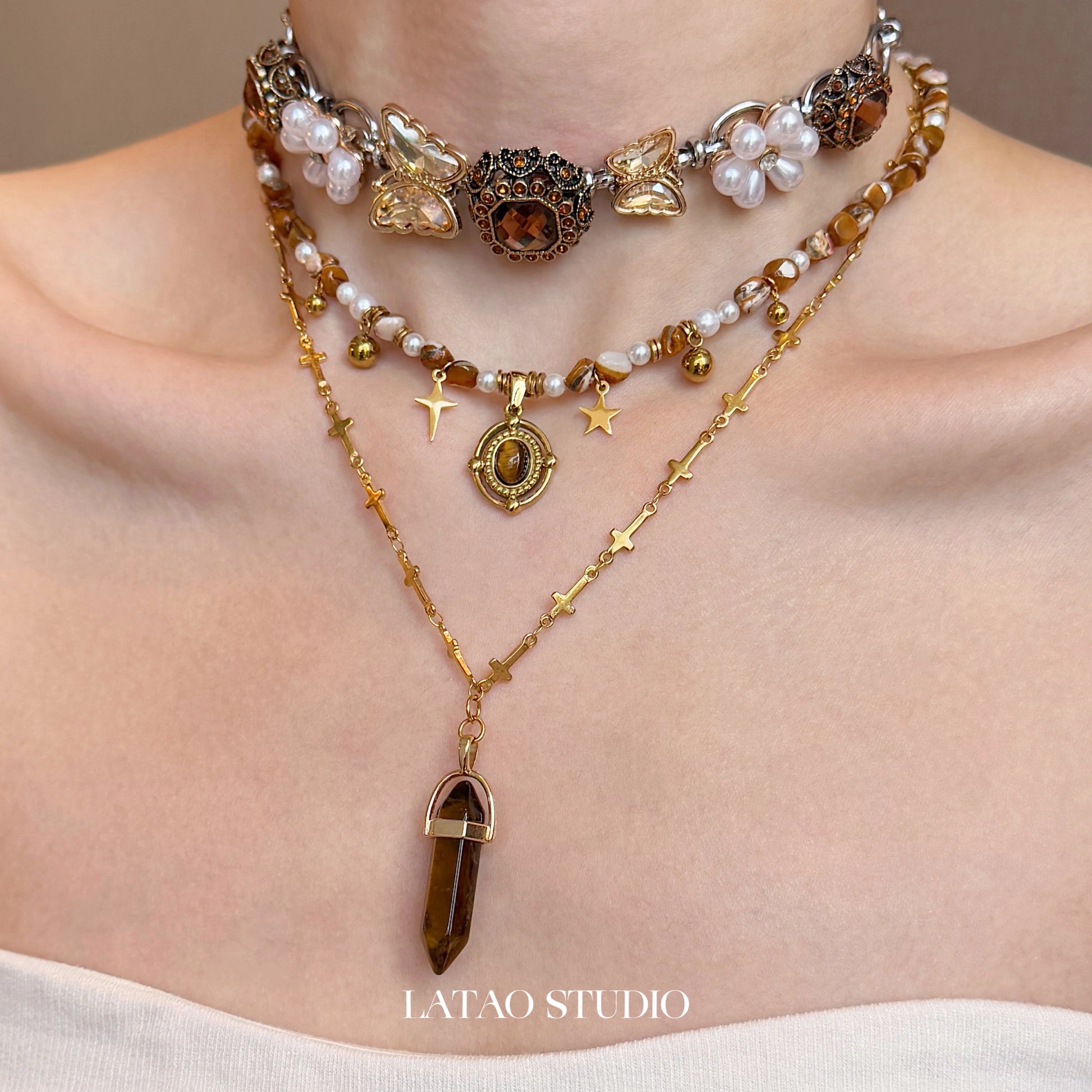 Late Autumn Brown Tiger Eye Flower Pearl Vintage Beaded Necklace