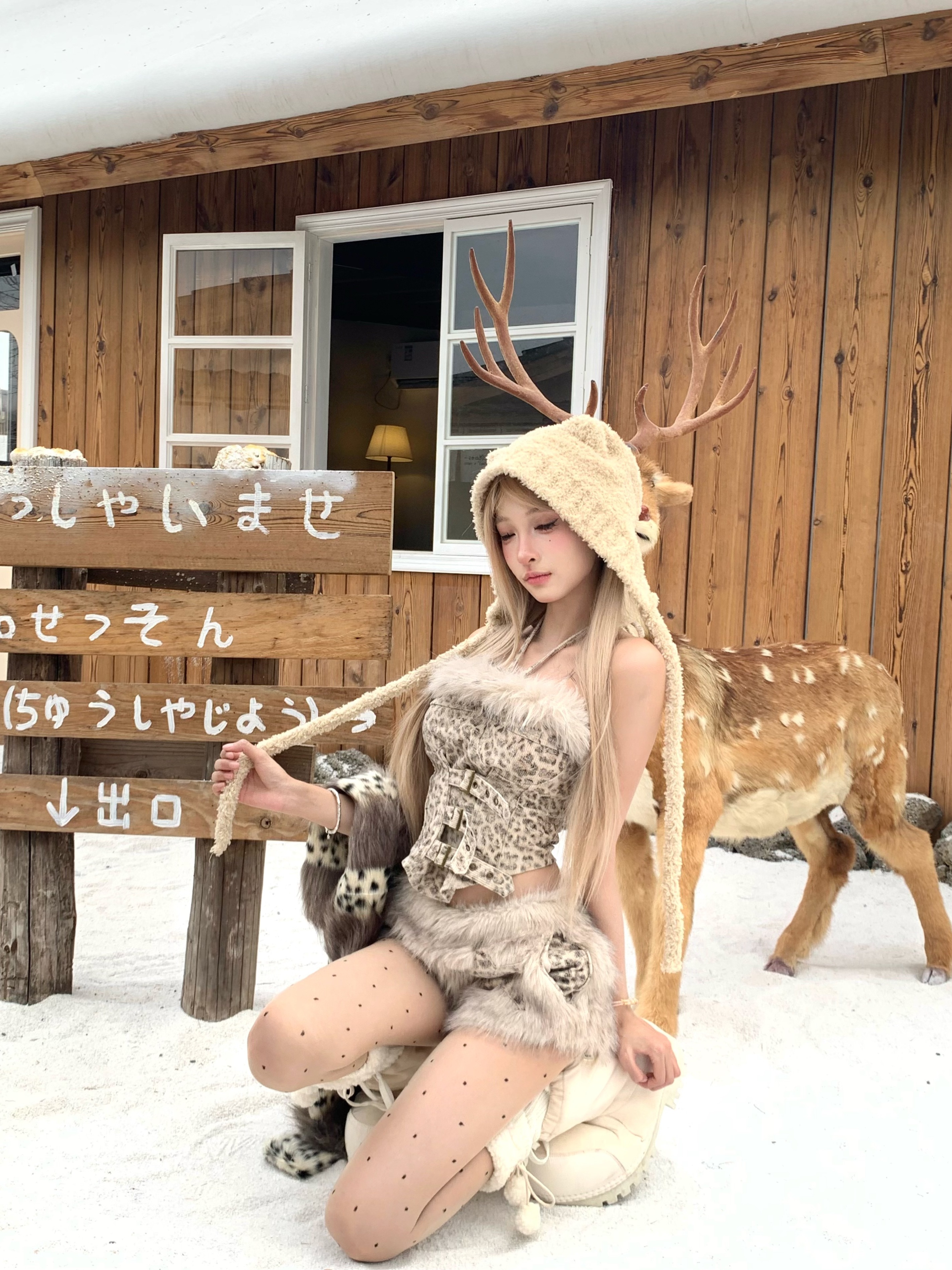Leopard print tube top faux fur coat shorts set