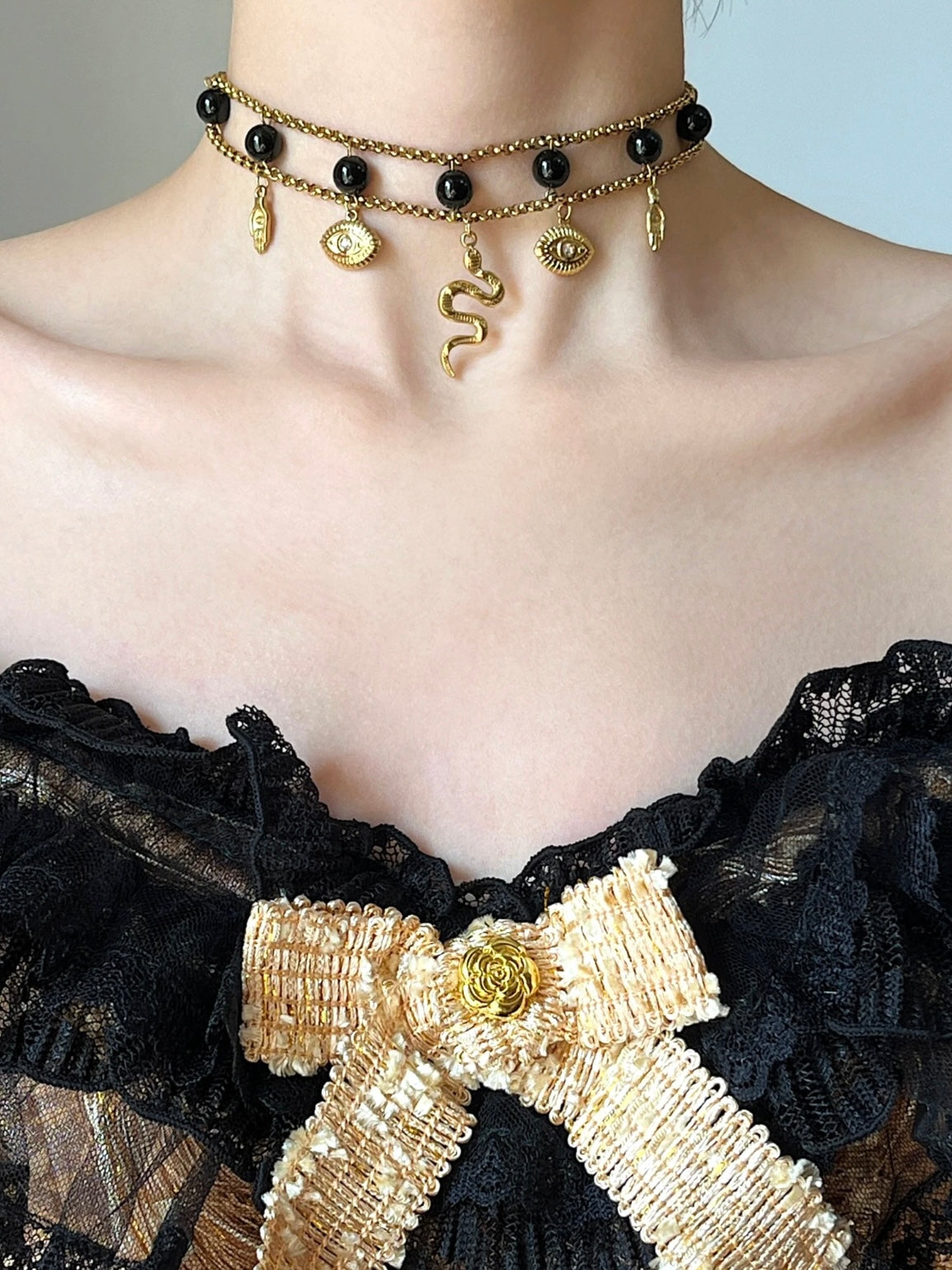 Midnight Sniper Black Gold Medusa Snake Titanium Steel Agate Necklace