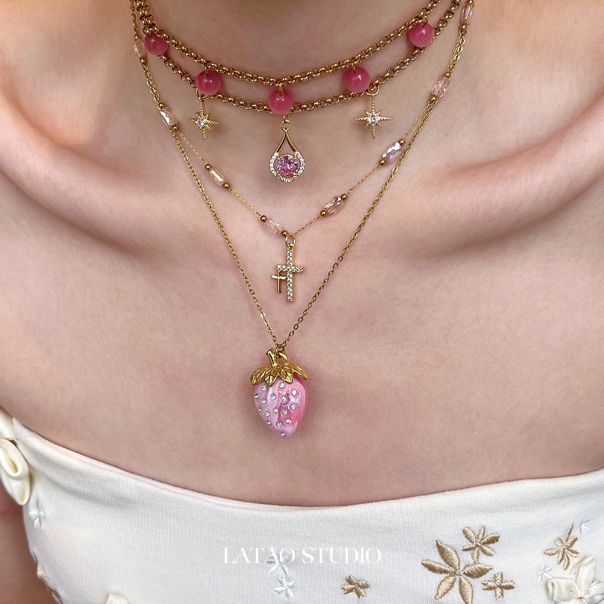 Pink Cat Eye Cross Strawberry Titanium Steel Necklace