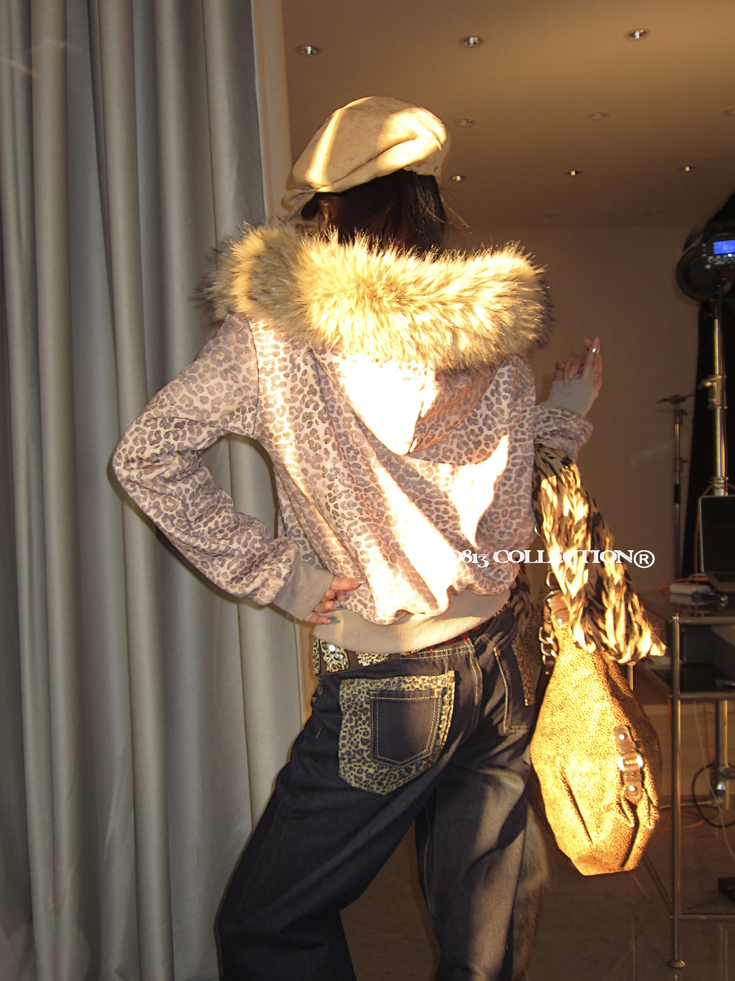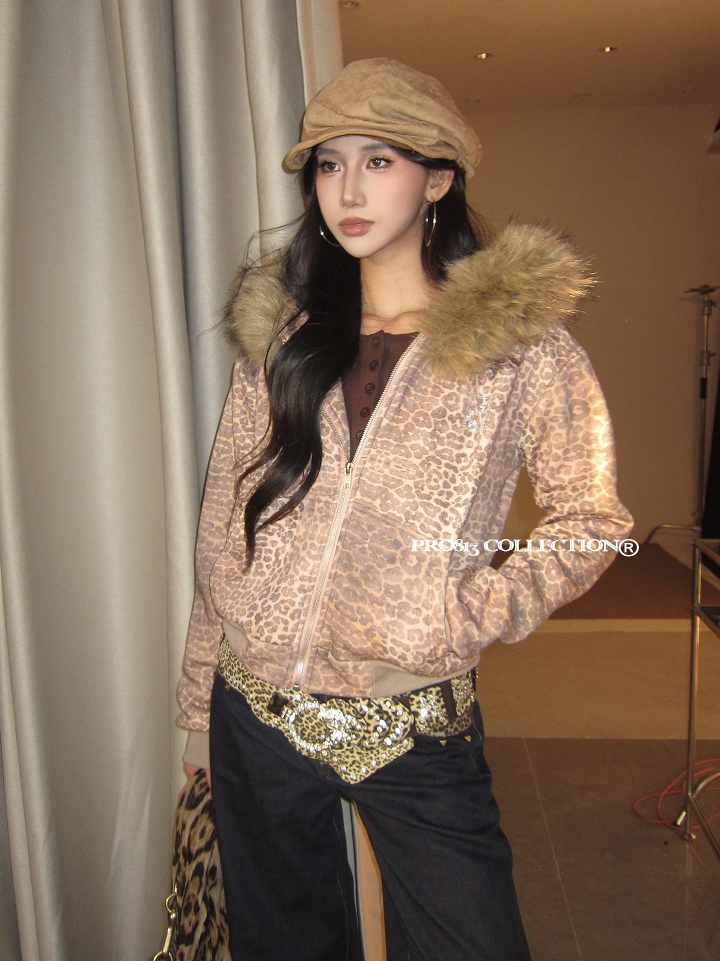 Pink hot diamond leopard print thin fleece hooded sweatshirt