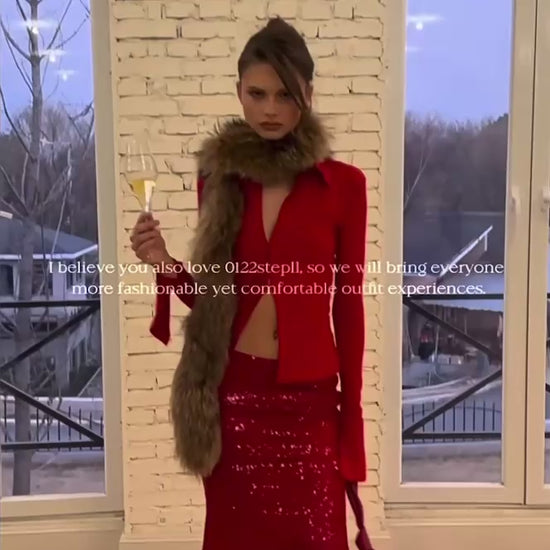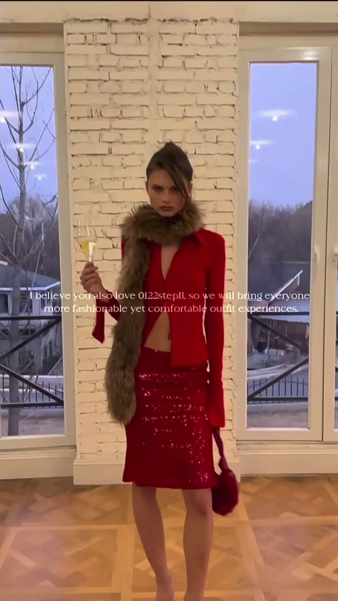 Red Slim Top Sequined Hips Fishtail Skirt Set