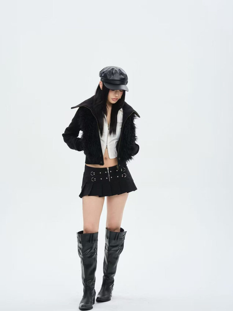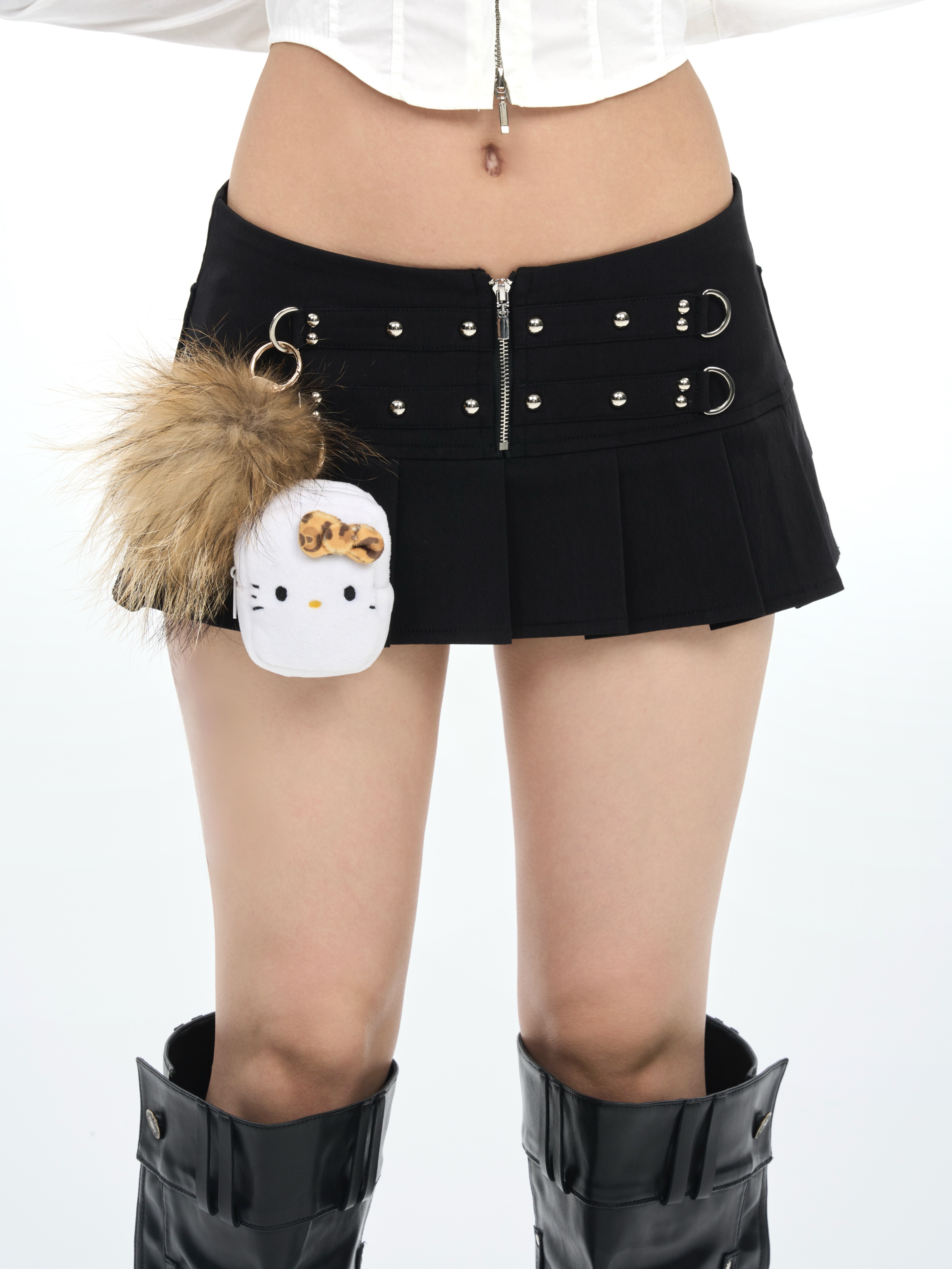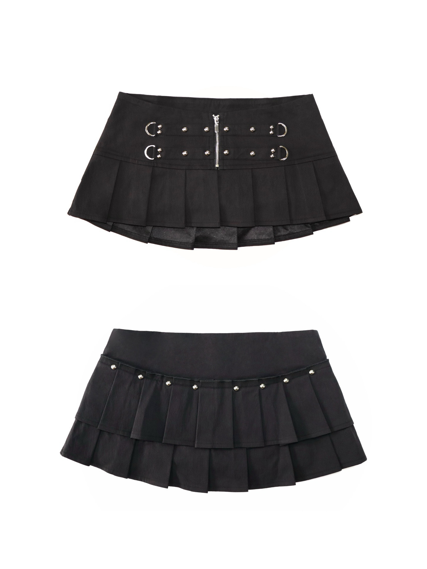 Rivet-embellished zip-pleated black mini skirt