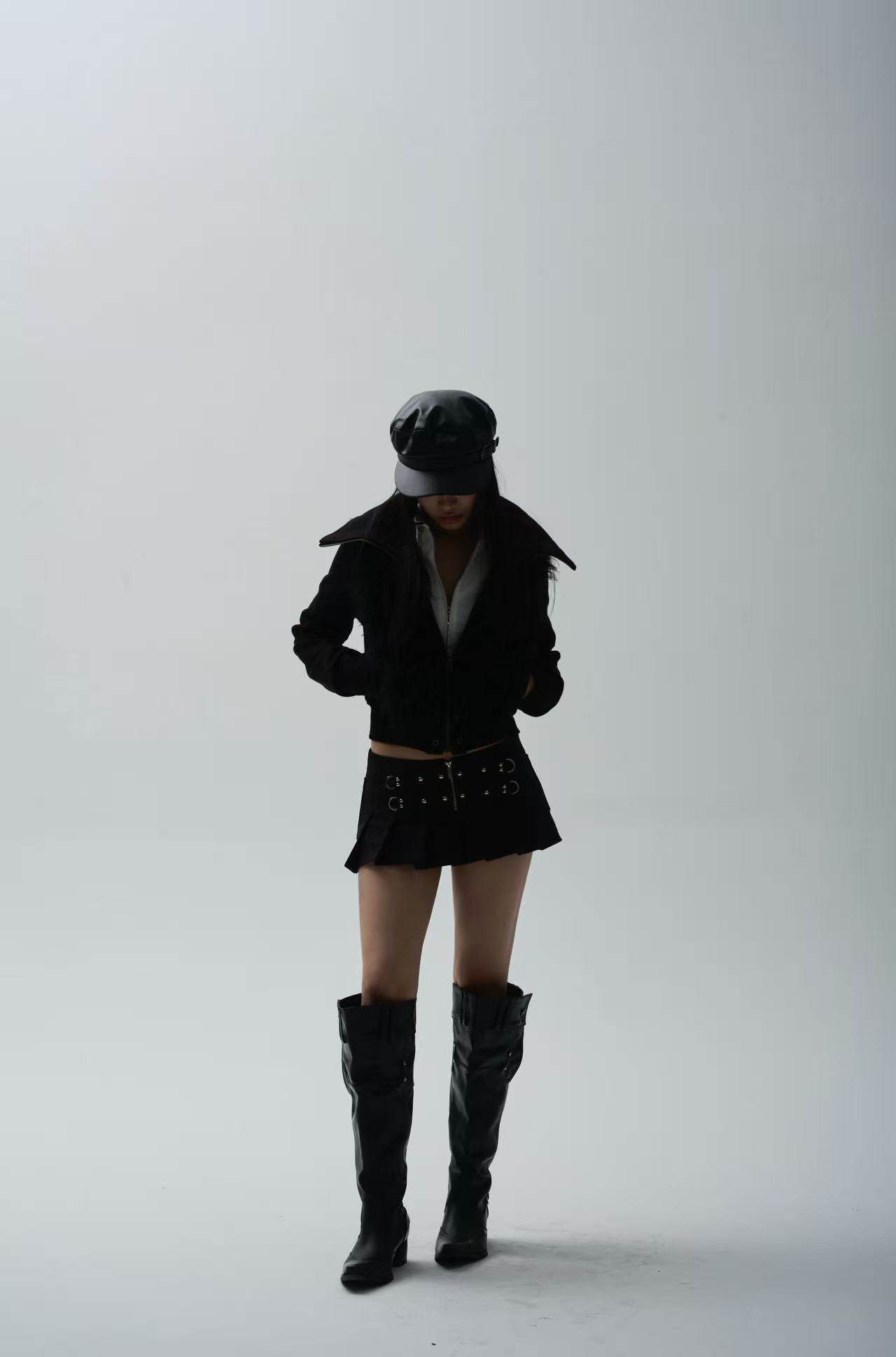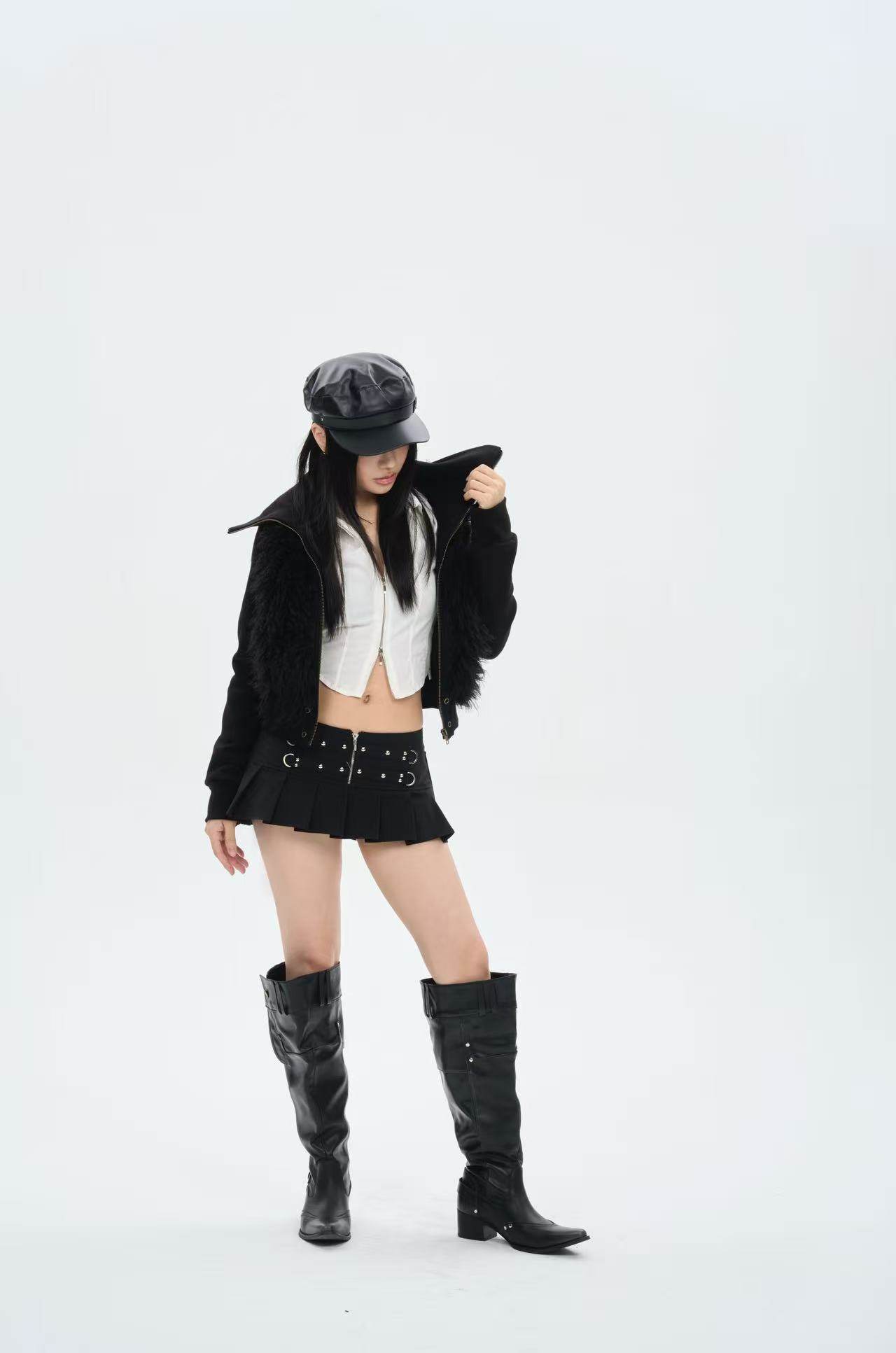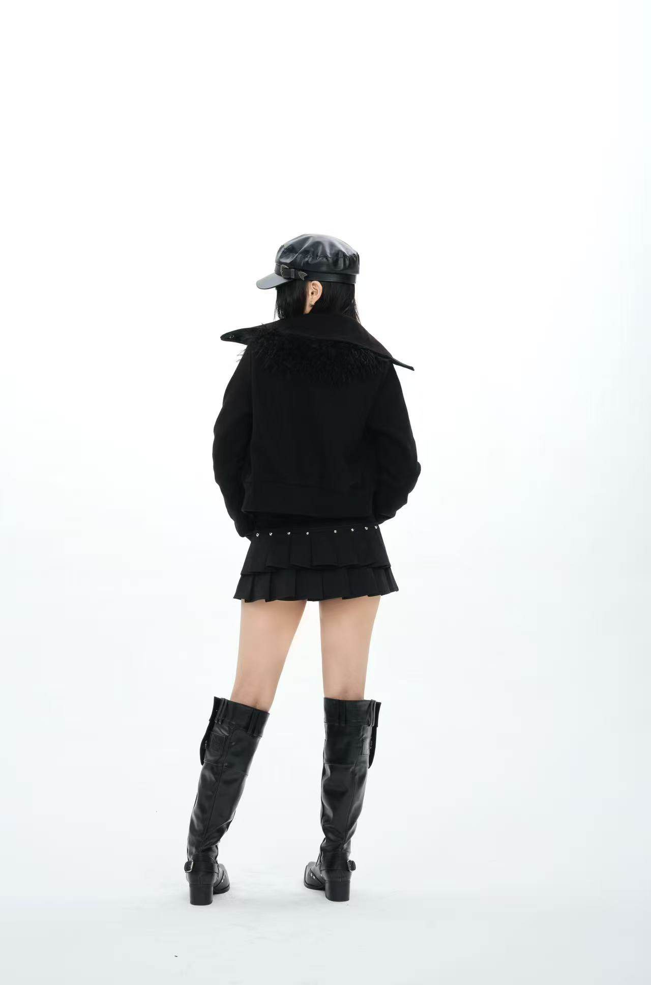 Rivet-embellished zip-pleated black mini skirt