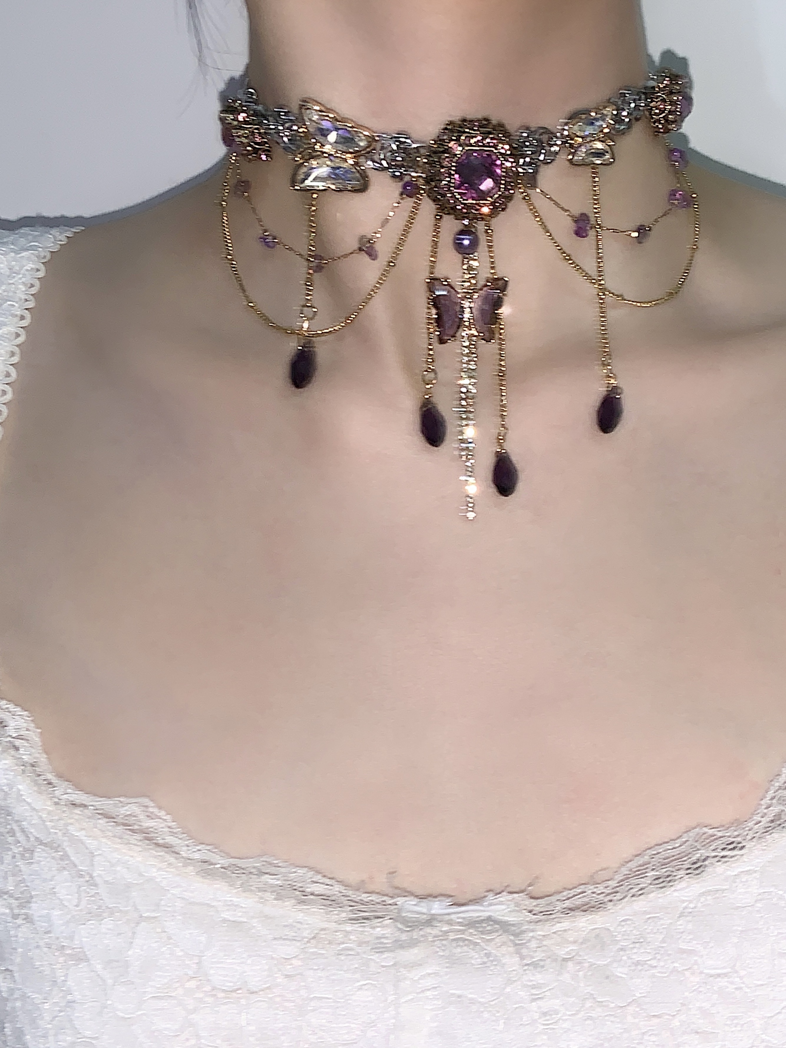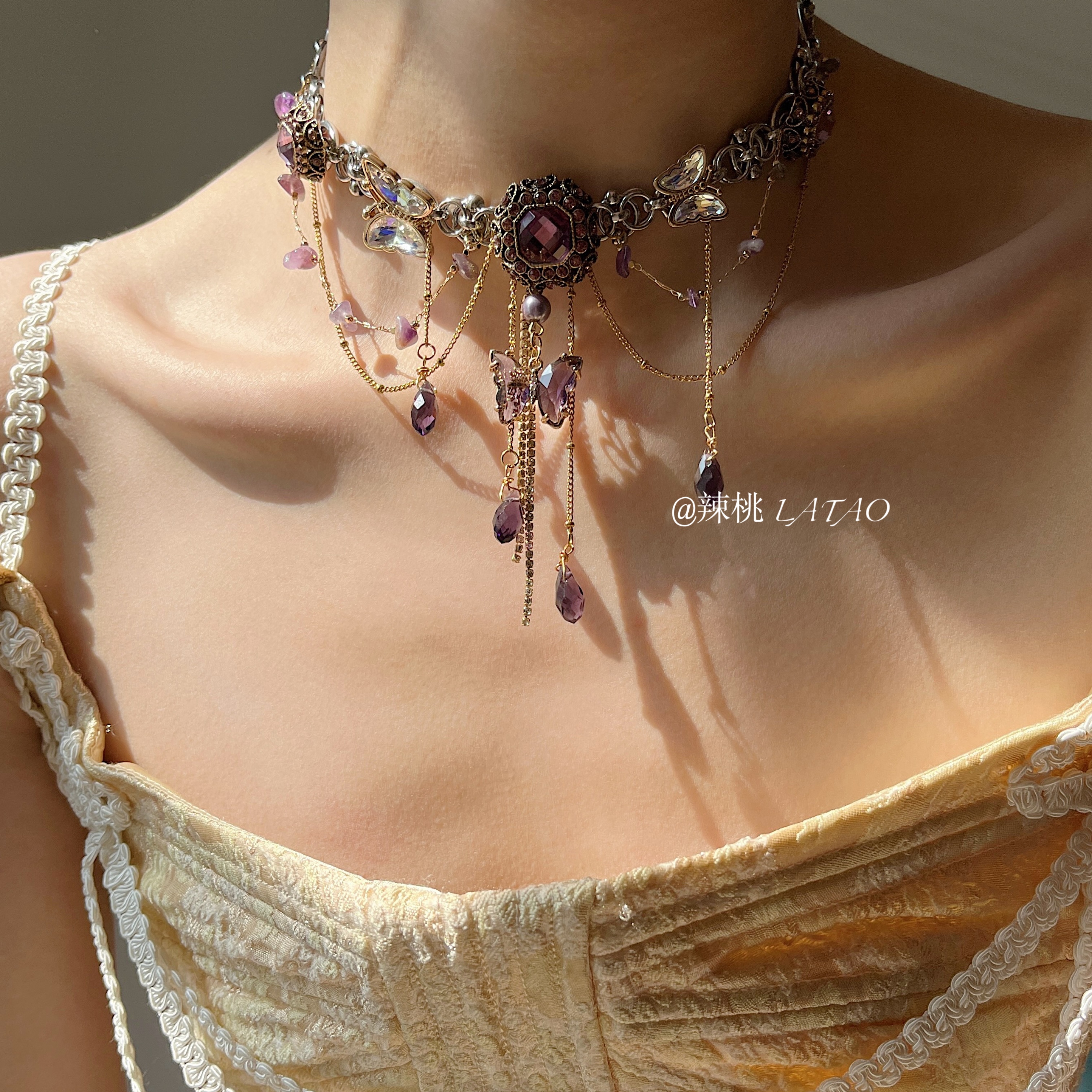 Tea Break Ball "Amethyst Retro Butterfly Tassel Titanium Steel Necklace