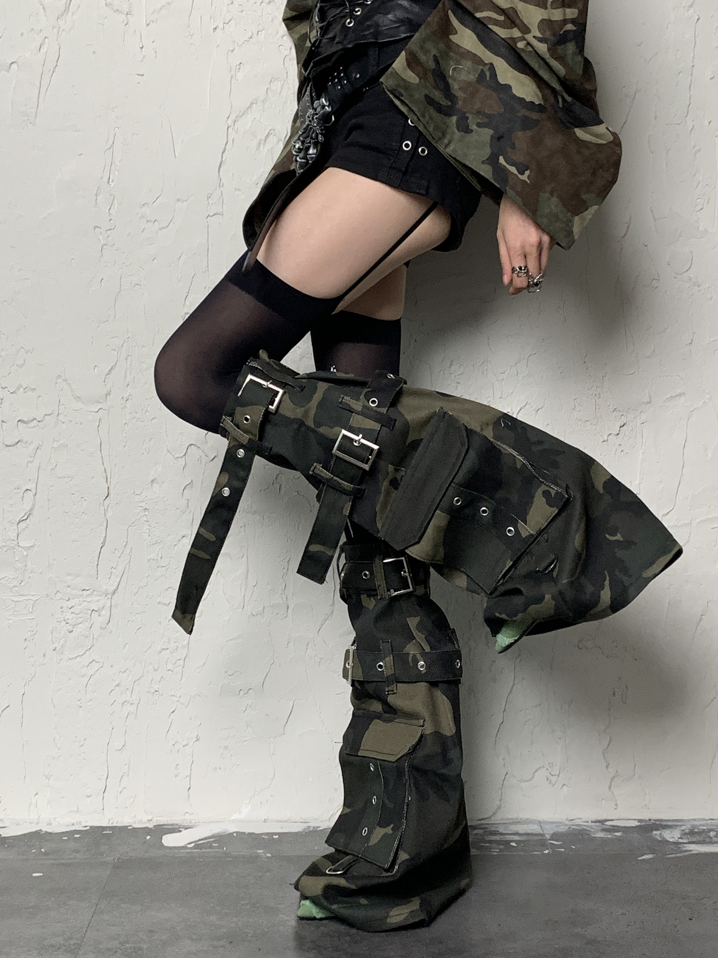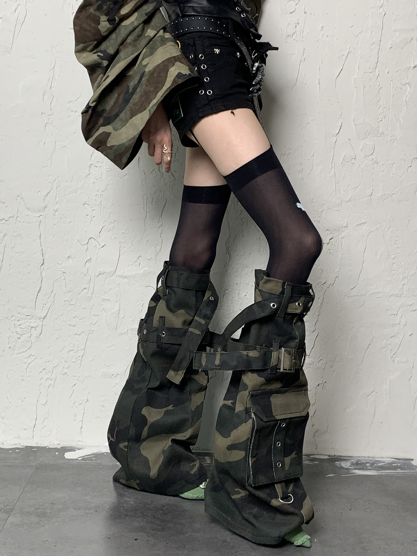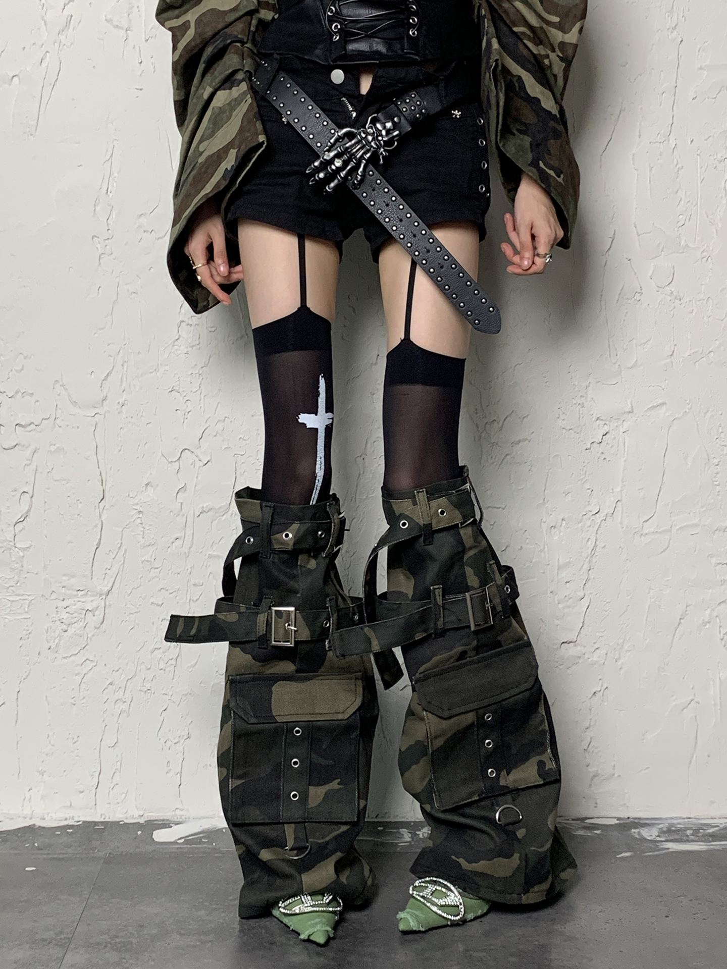 Y2K Apocalypse Sweetheart~White Bottom Black Cross Strap x Camouflage Punk Socks