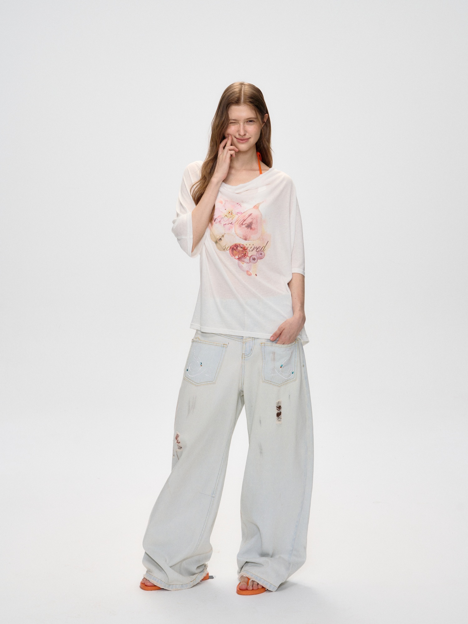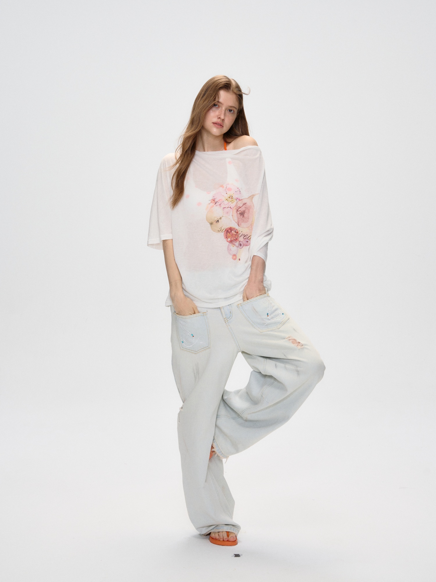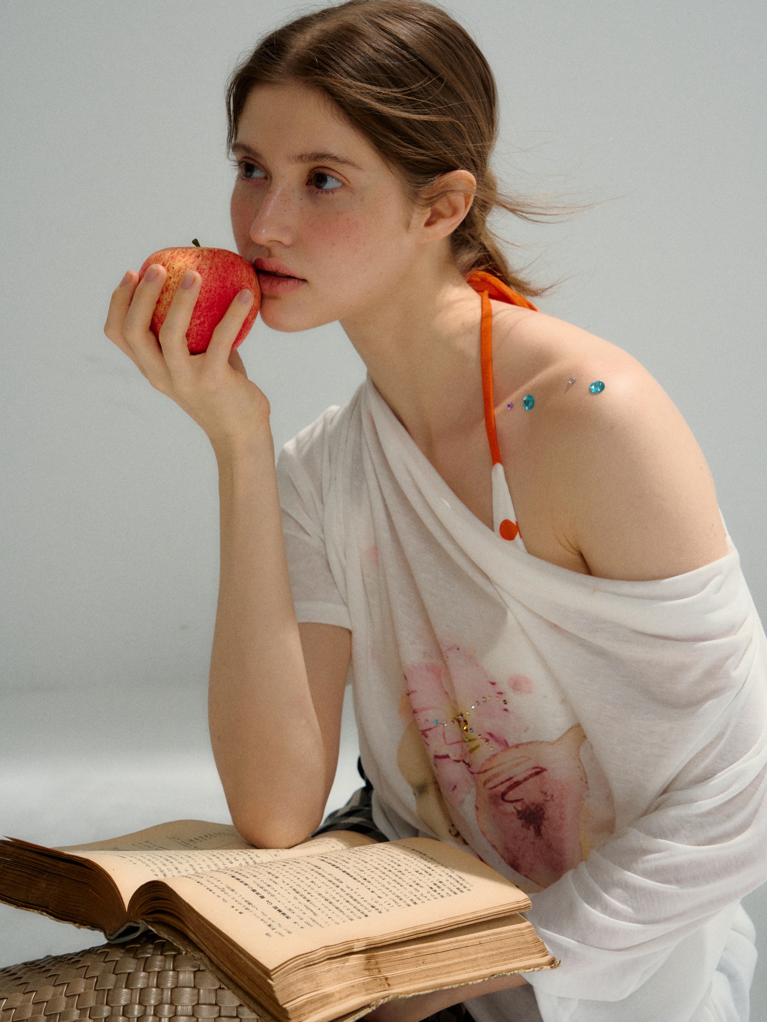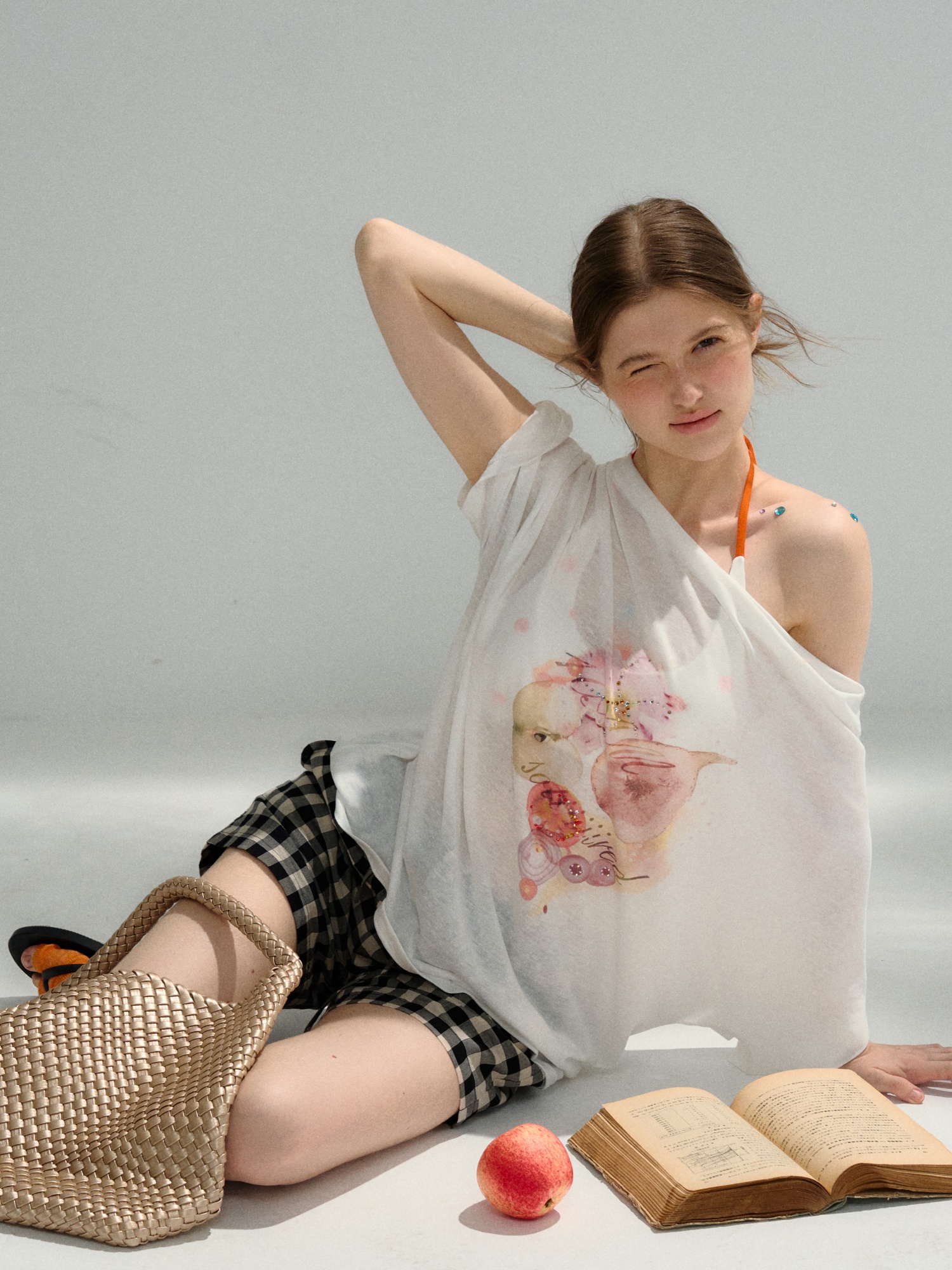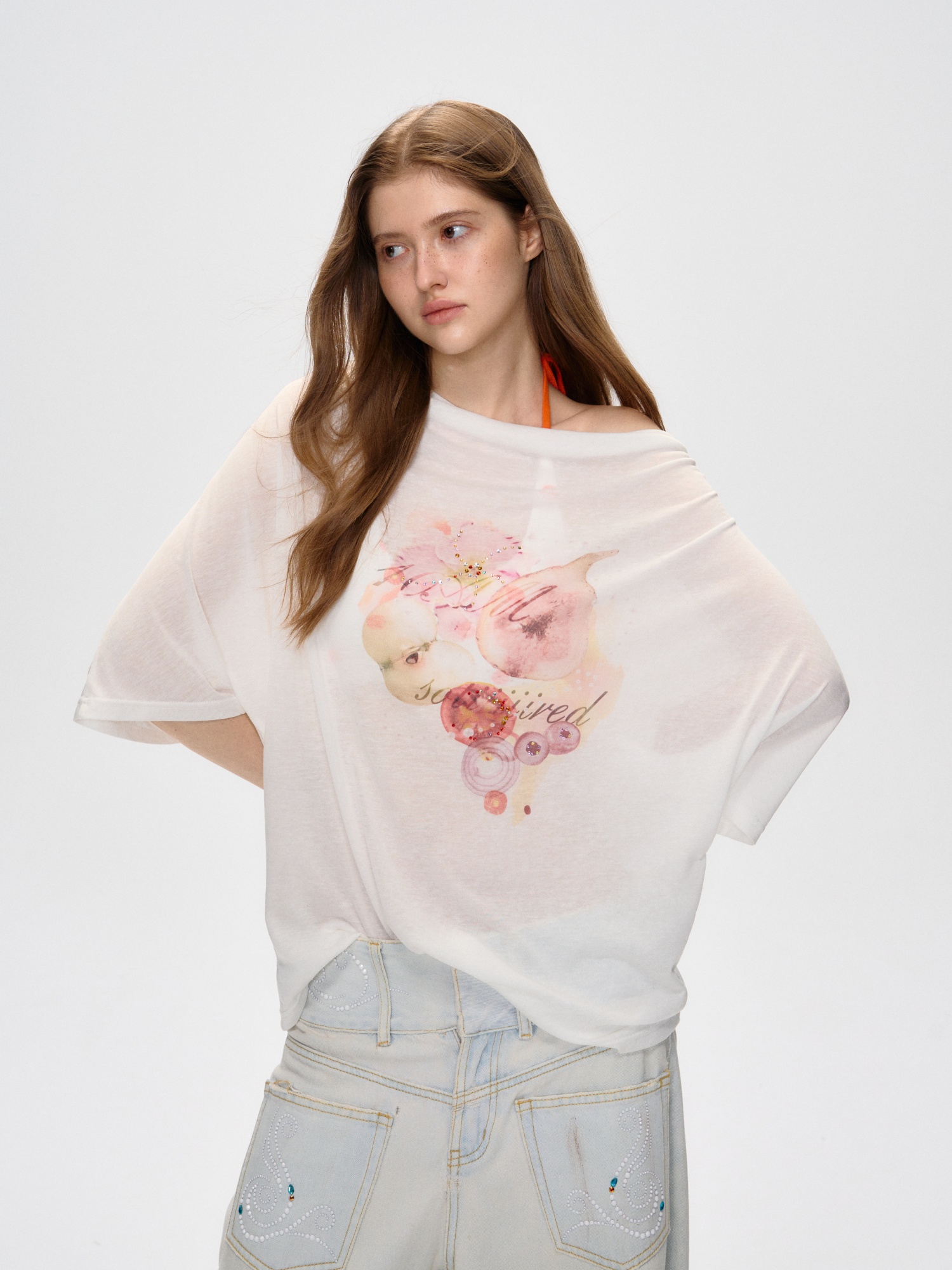 Lyocell Tencel Printed Rhinestone Top - Elbow Sleeve