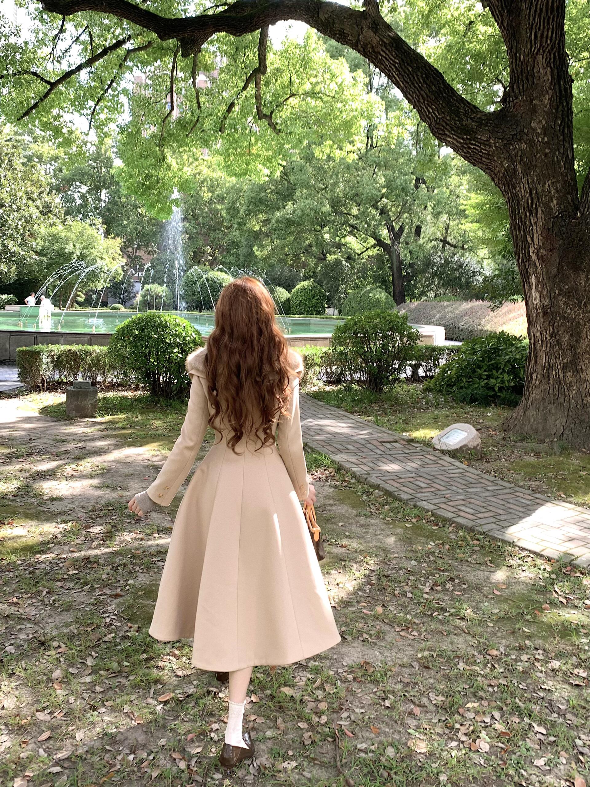 Beige Faux Fur Collar Flared Maxi Princess Coat