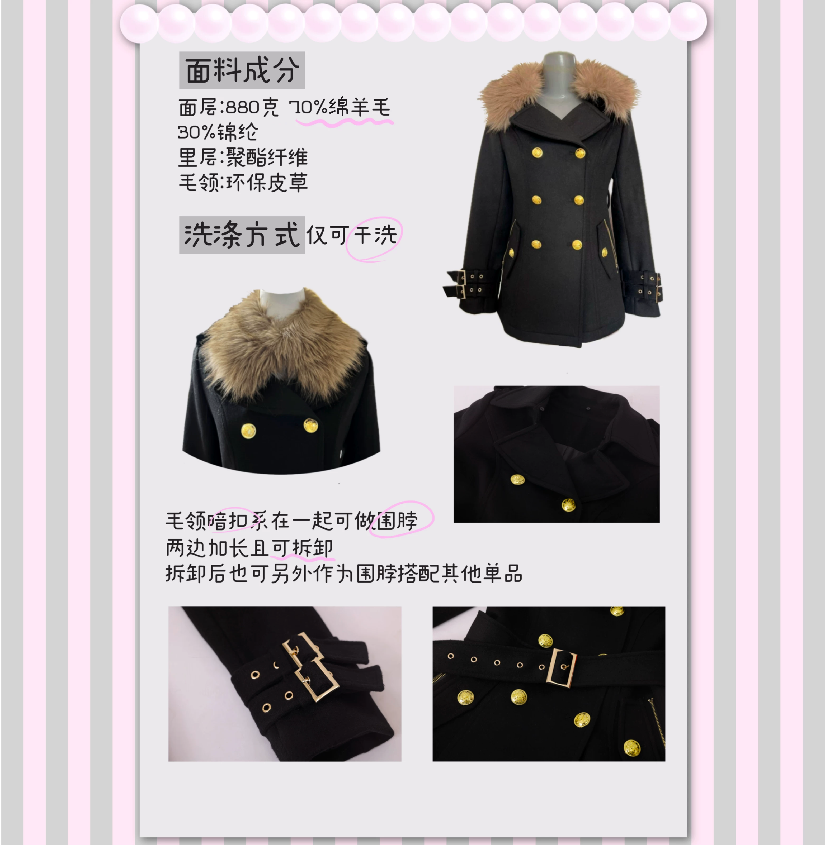 · The detachable fur collar is secured with hidden snaps and can be worn separately as a neck wrap