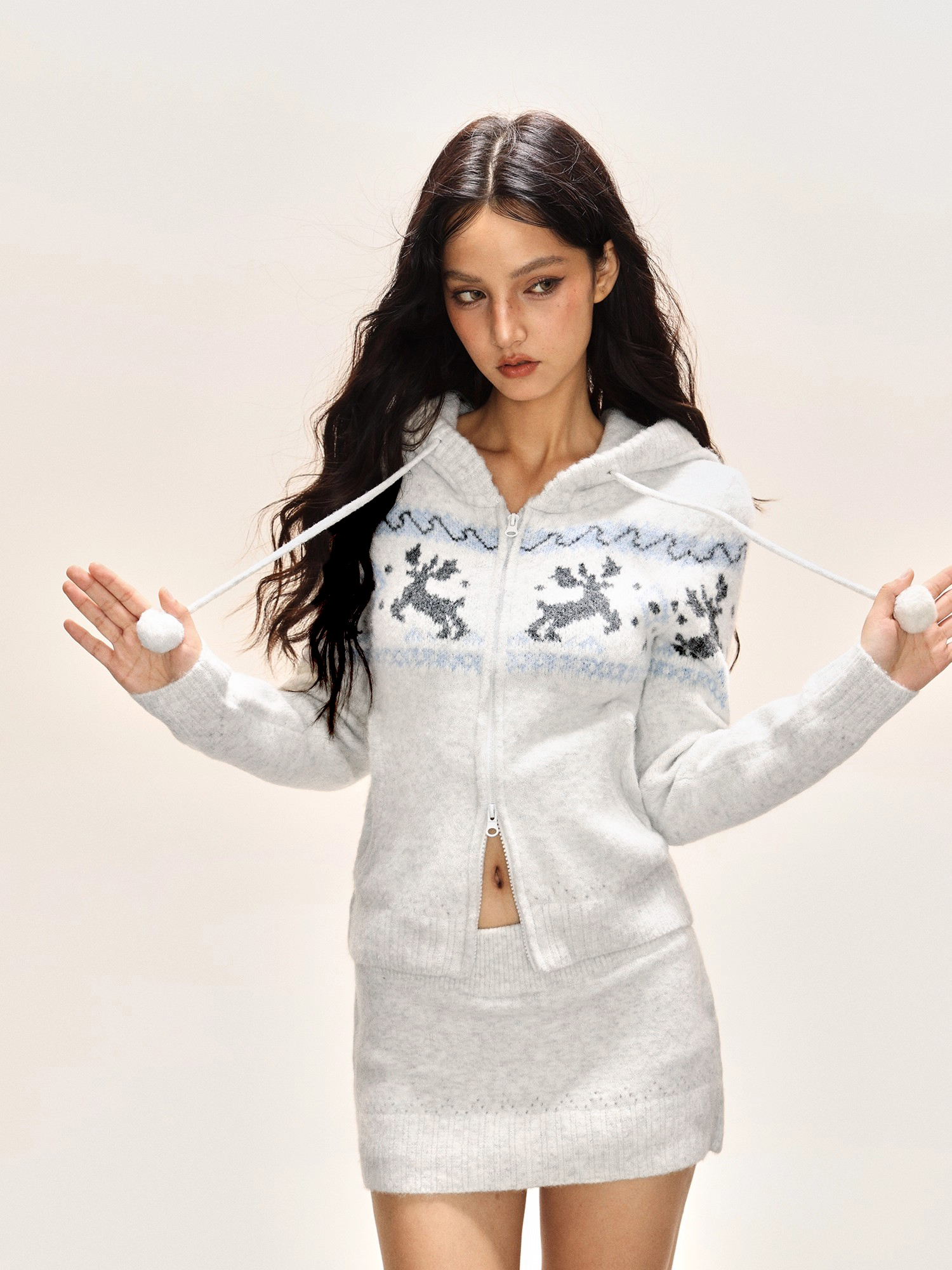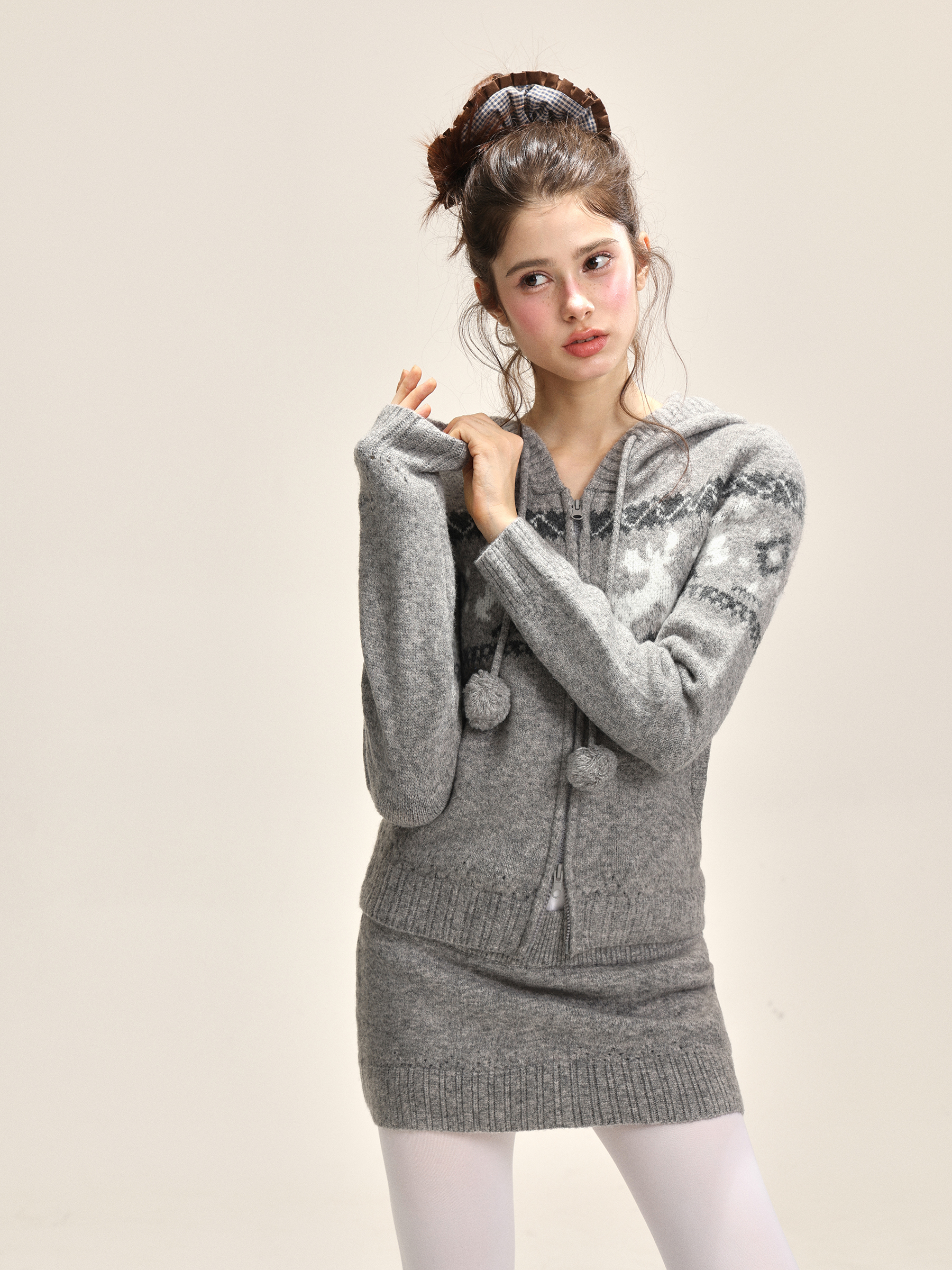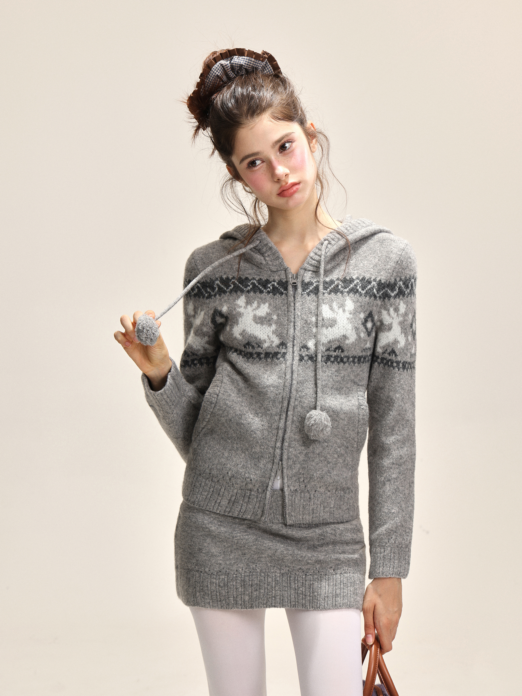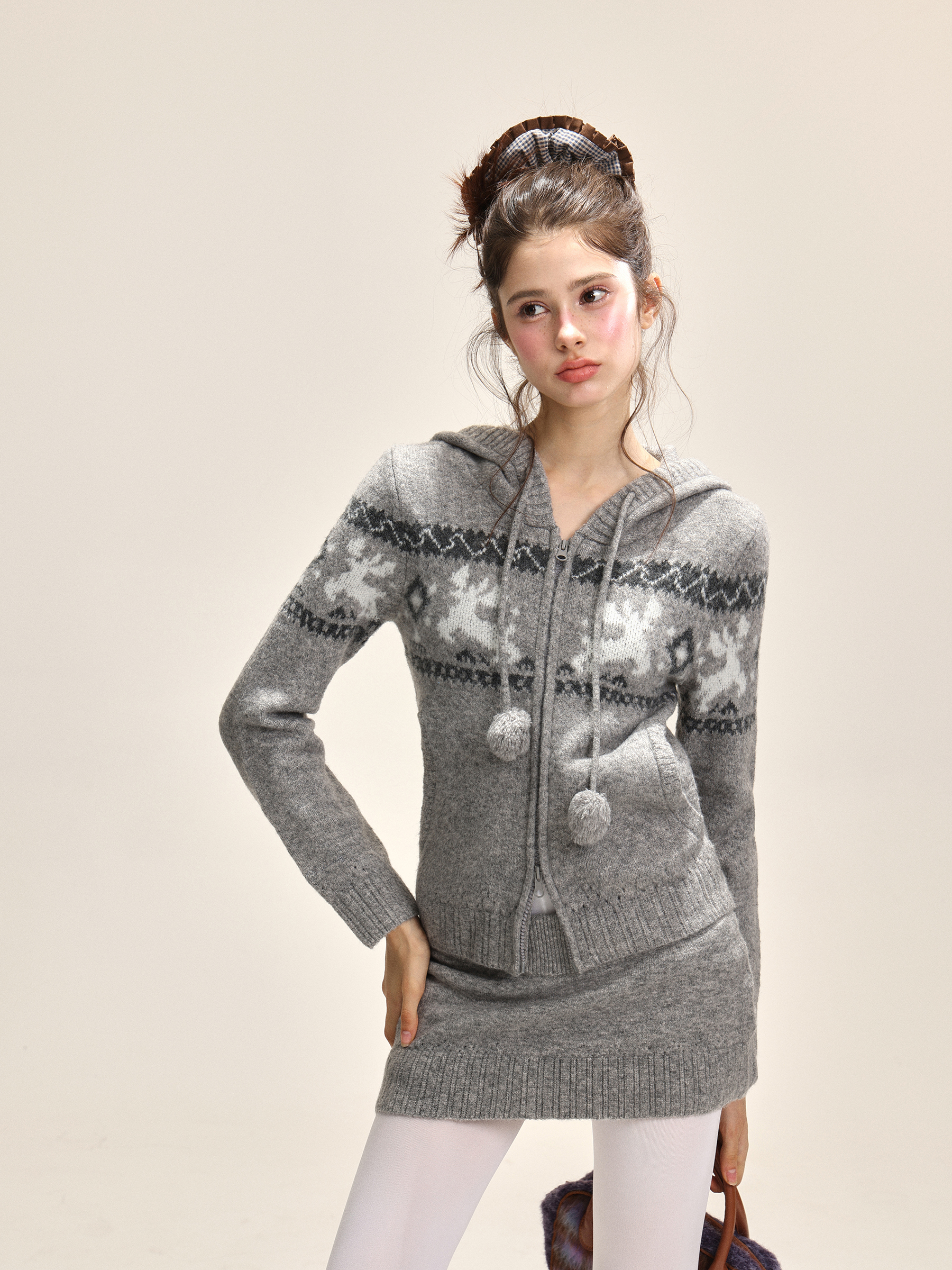Elk jacquard hooded short skirt, knitted set