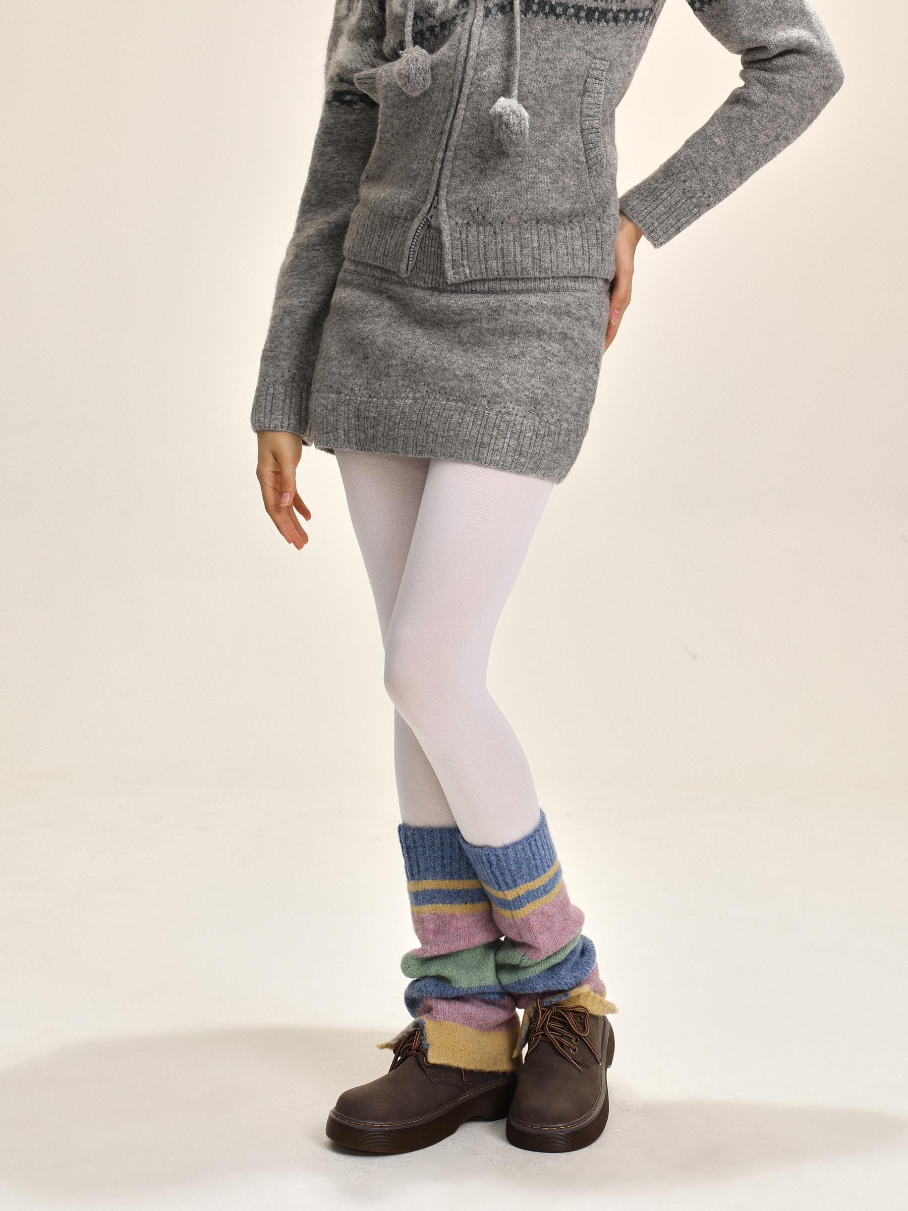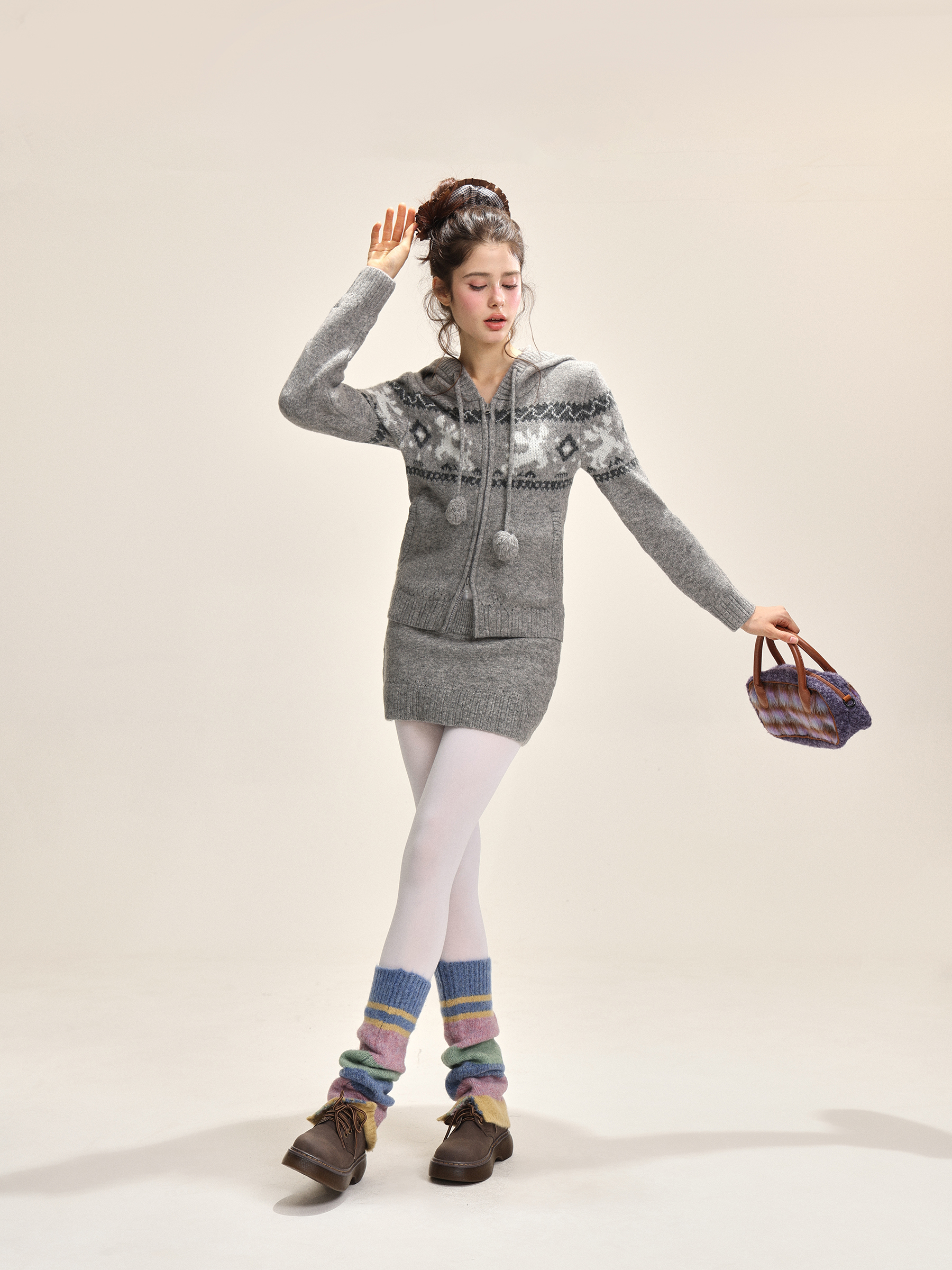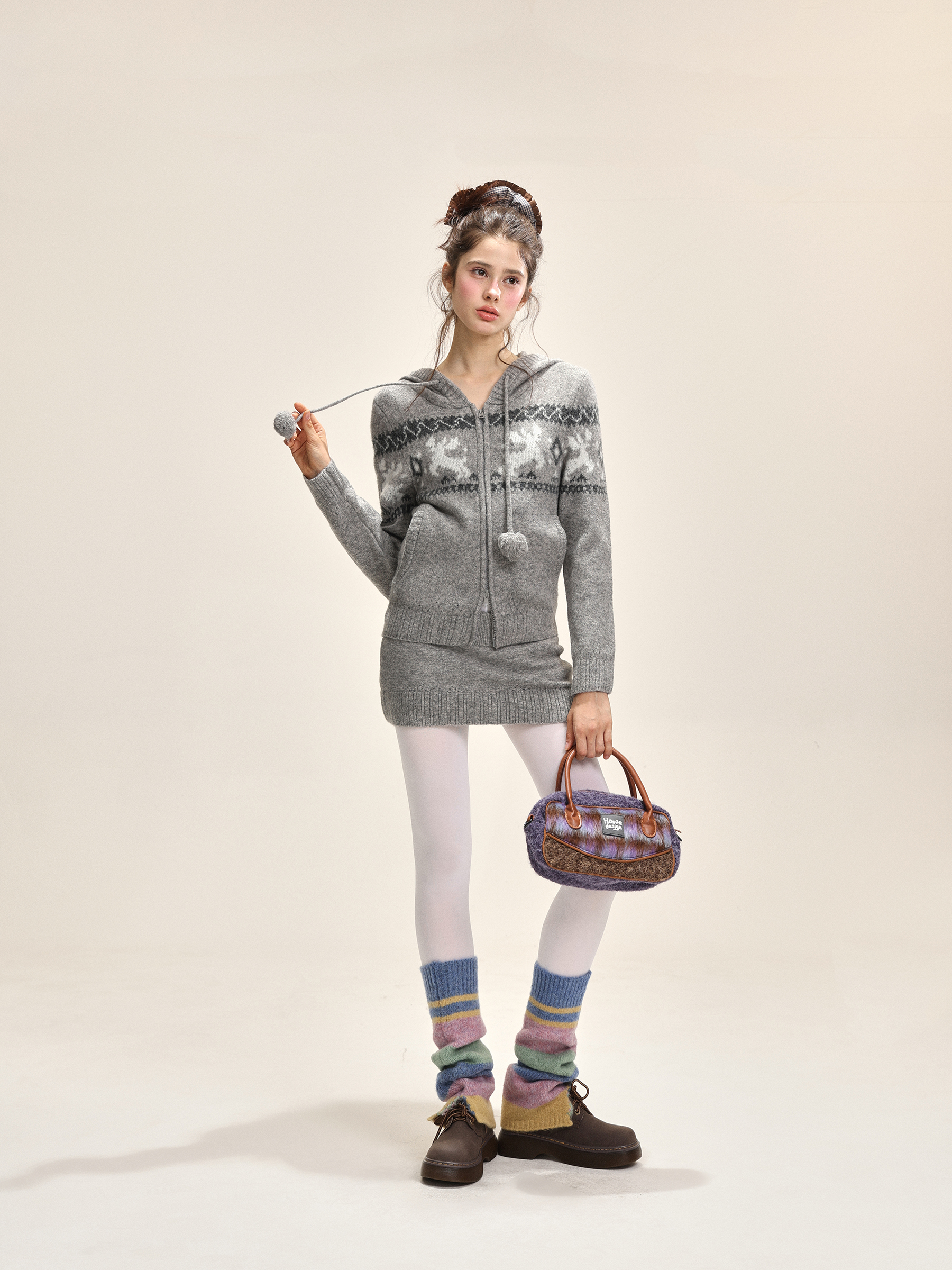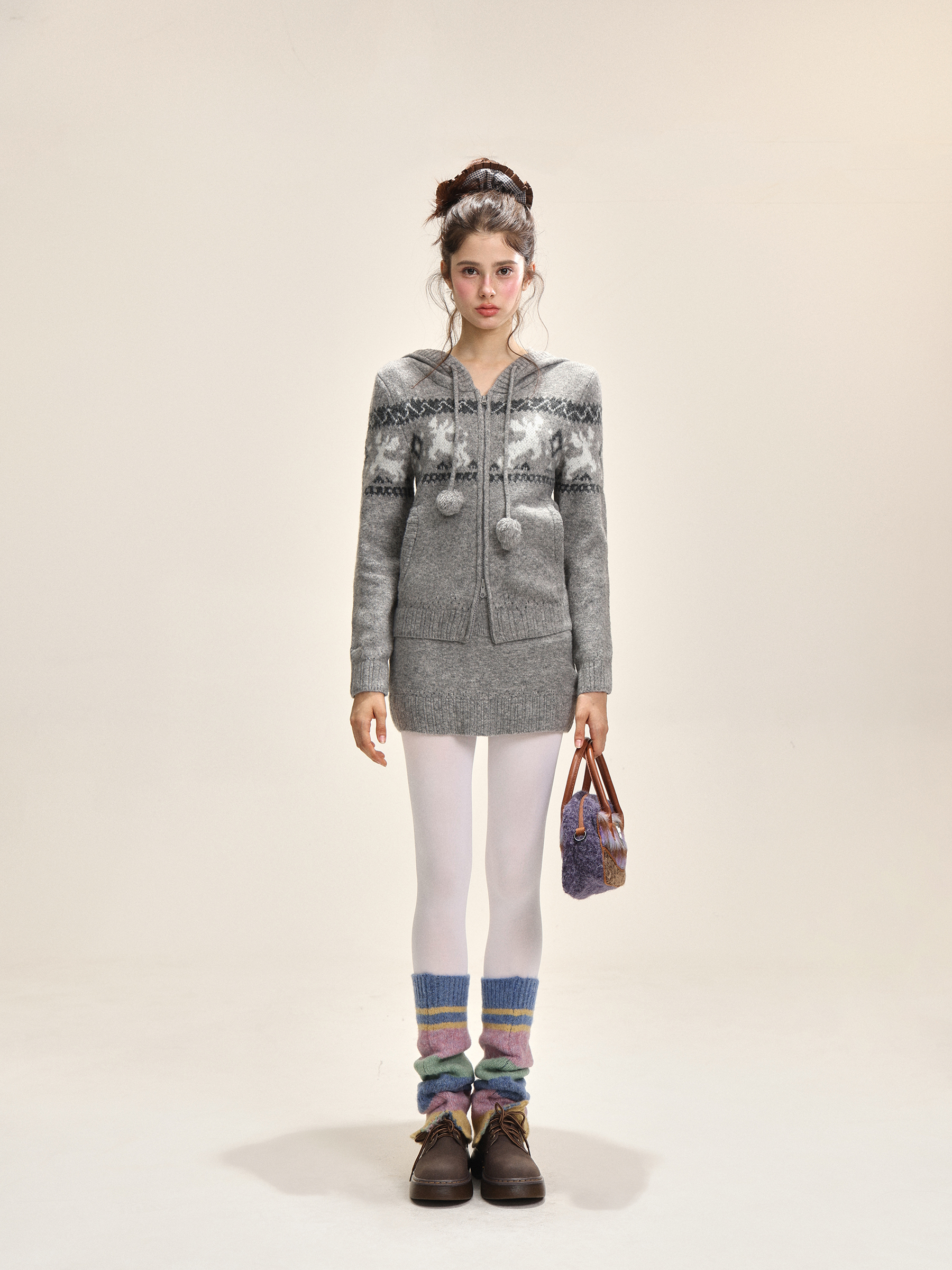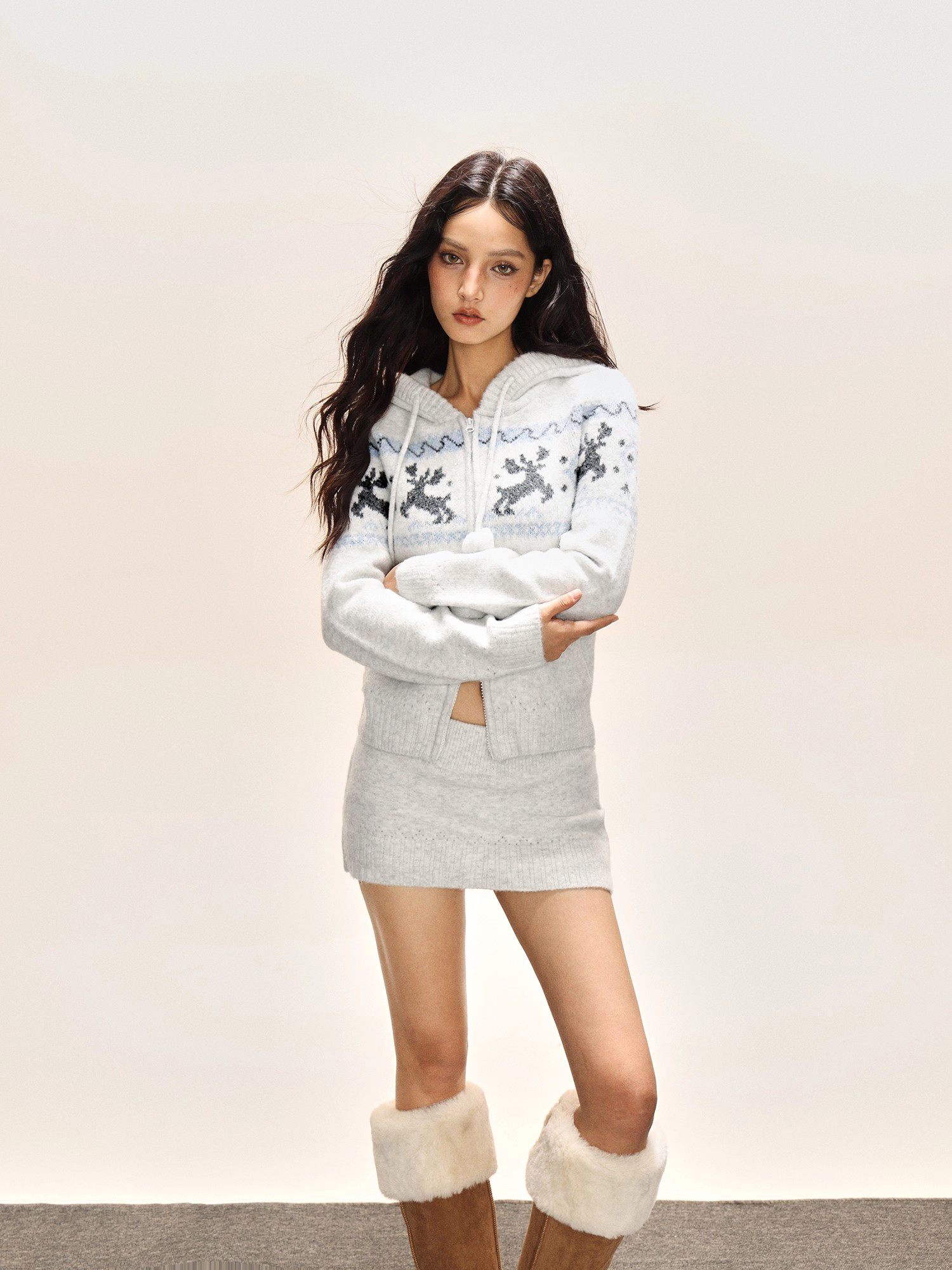 Elk jacquard hooded short skirt, knitted set