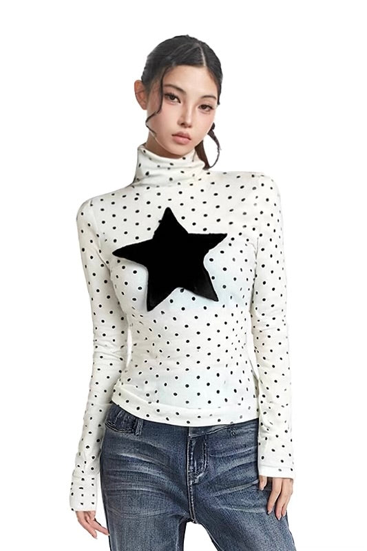 High neck polka dot heart-shaped long sleeved Top