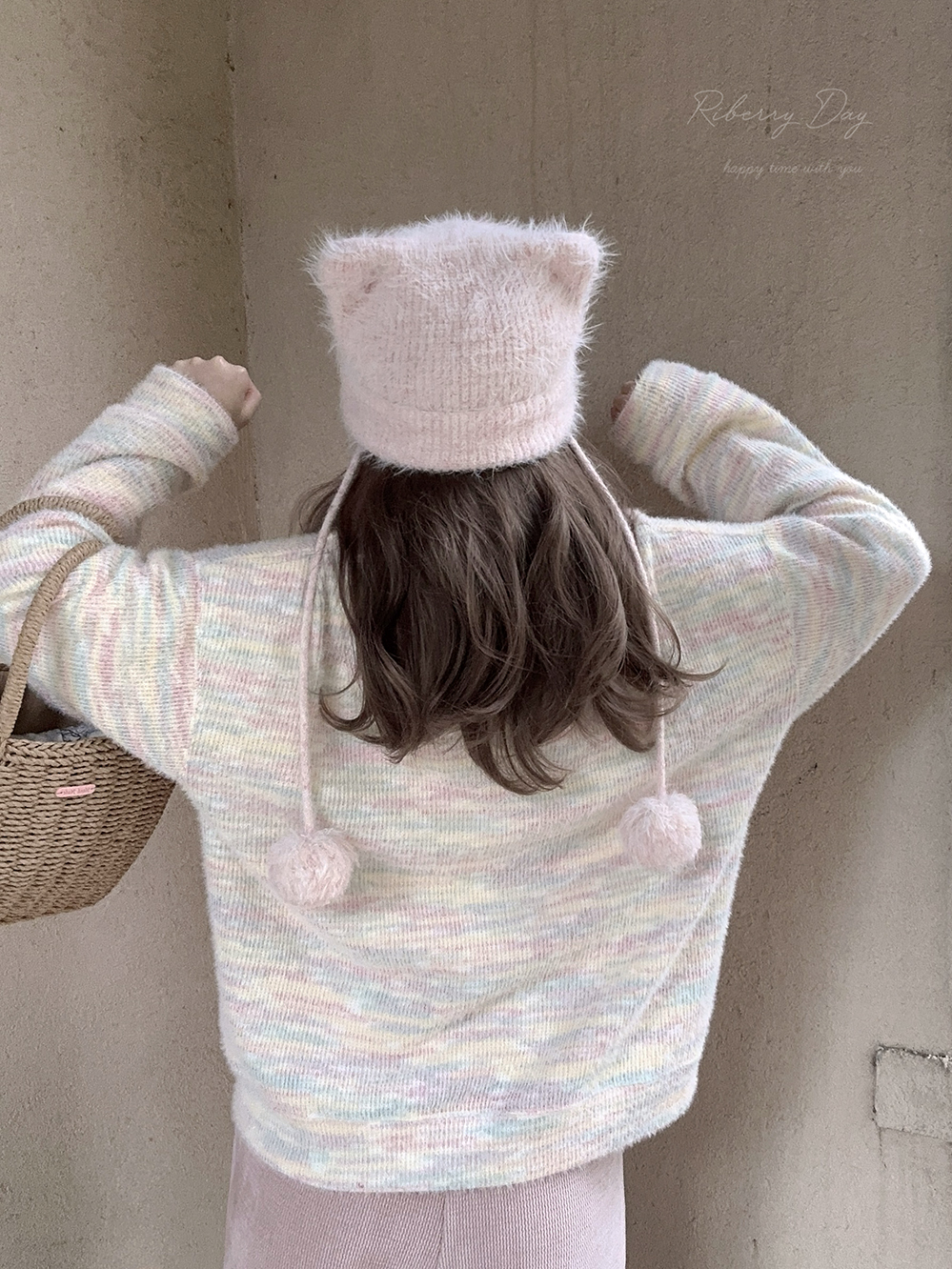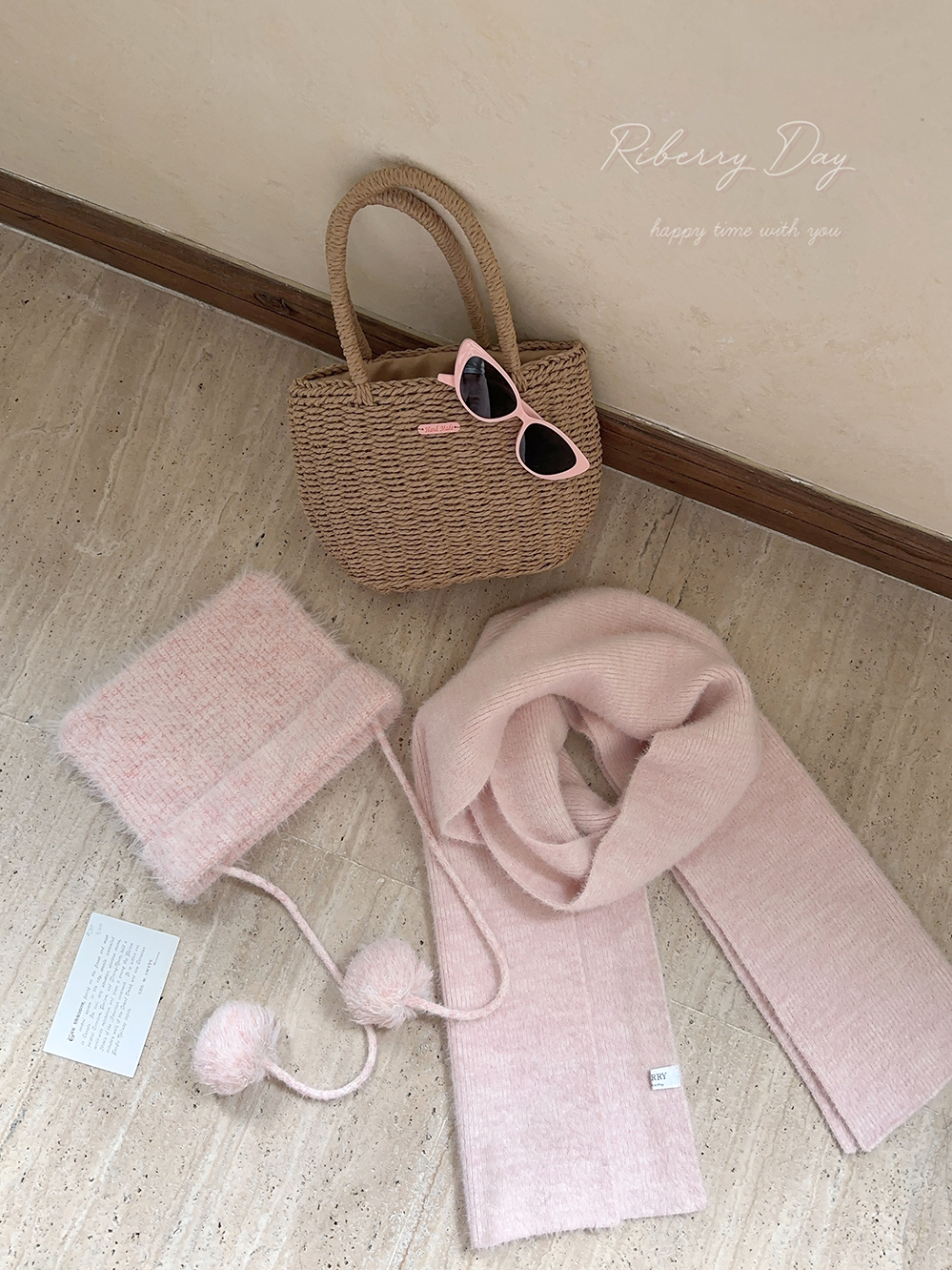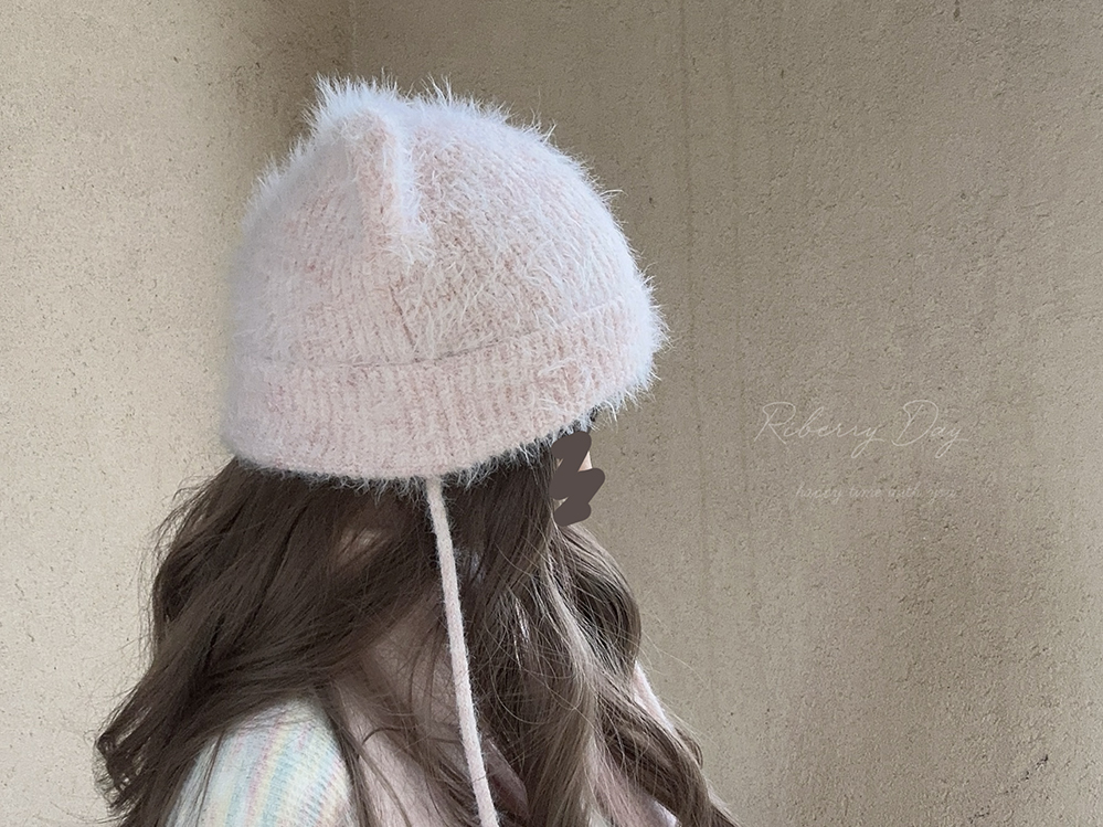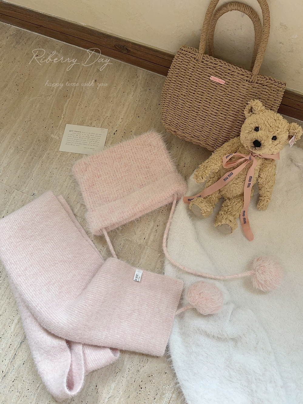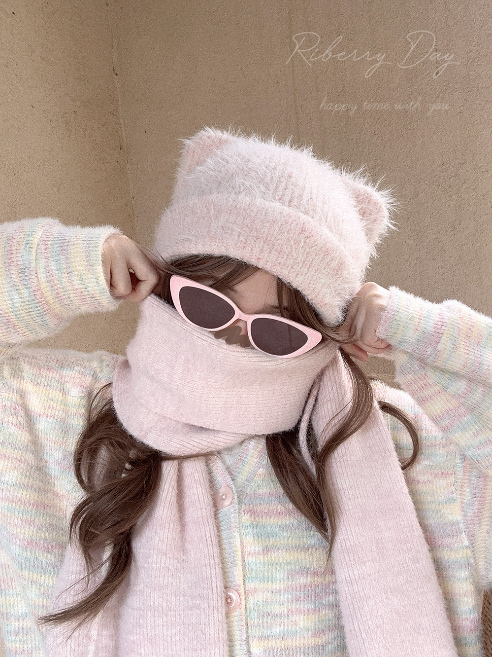 Imitation mink fur soft pink handmade fur ball cat ear hat scarf