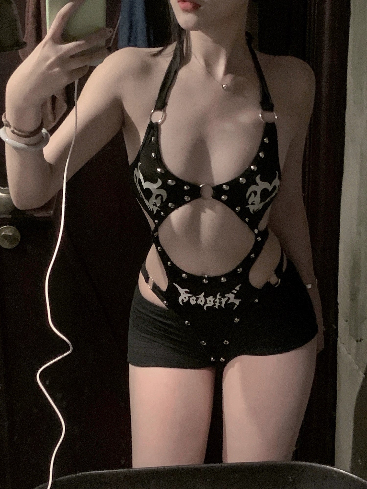 Interstellar Ballet Sparkling Rivet Decorative PU Leather Skirt jumpsuit