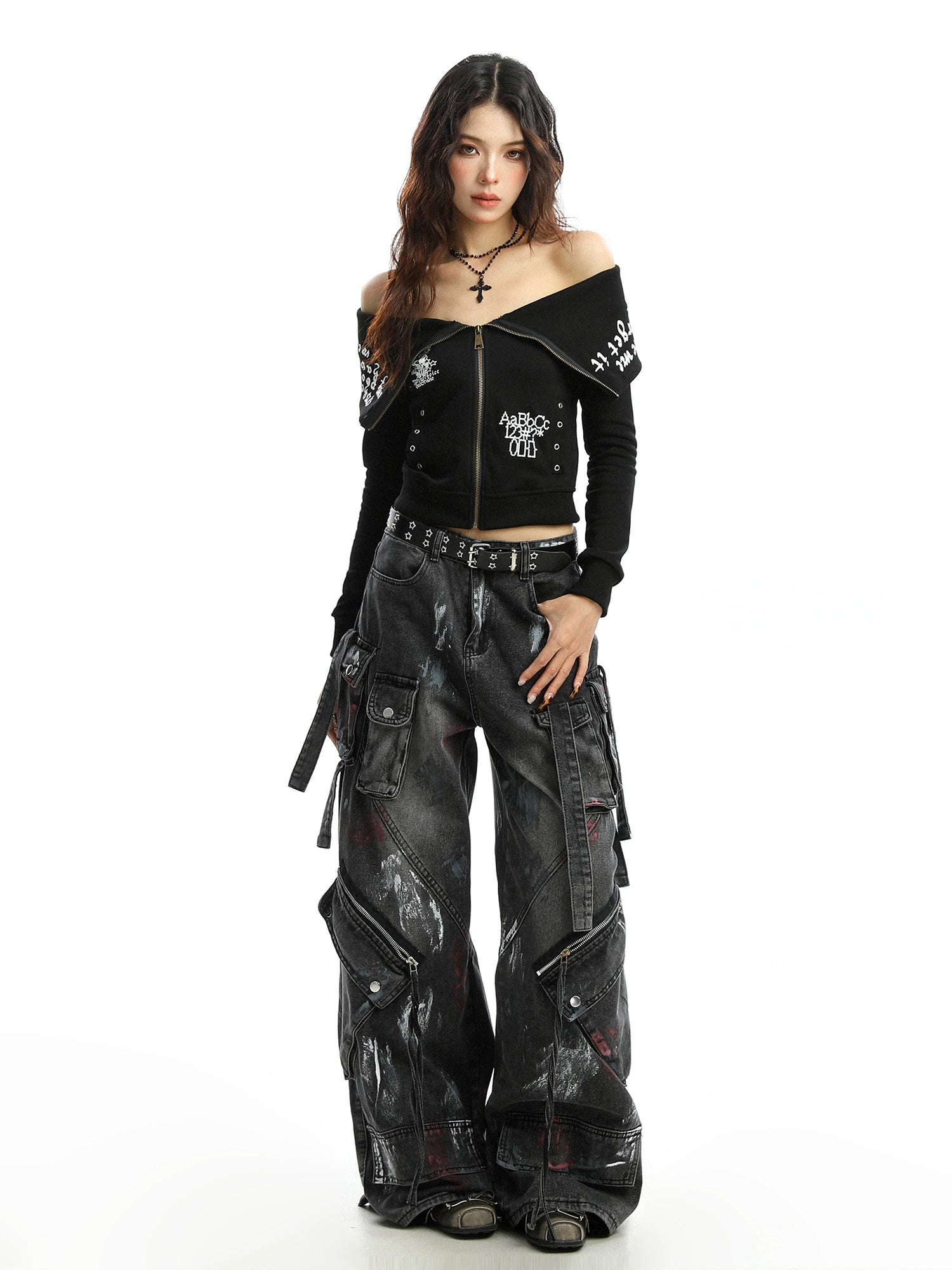 Large collar zipper one shoulder hoodie
