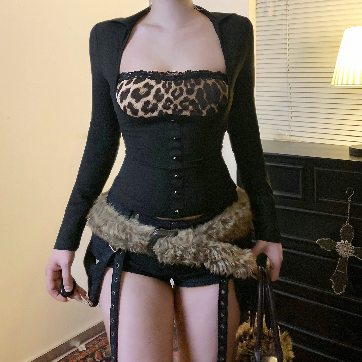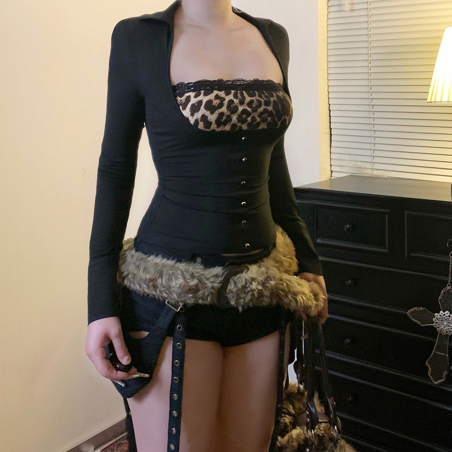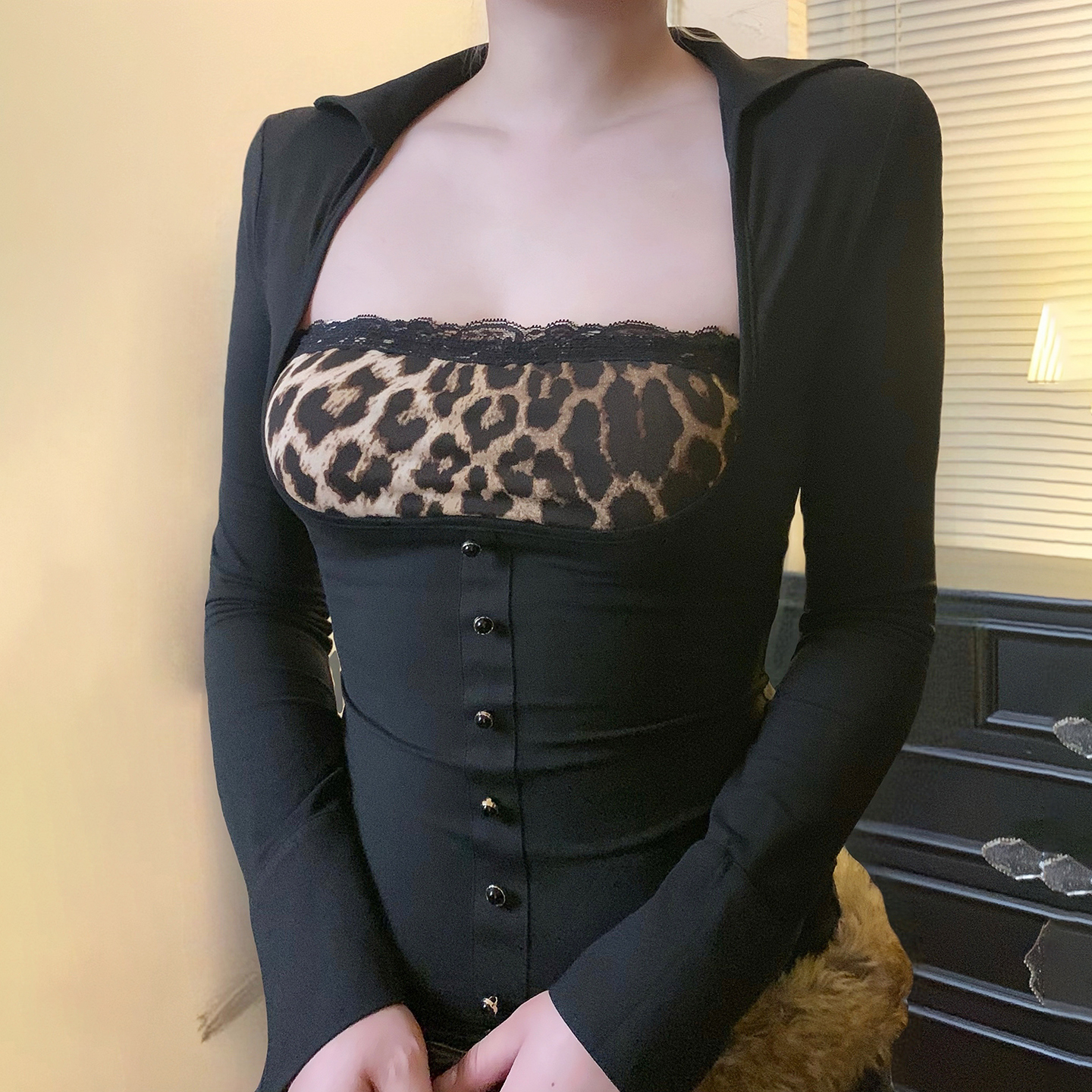 Leopard lace patchwork buckle design long sleeved T-shirt