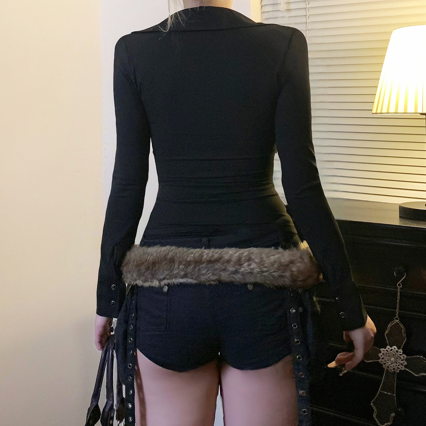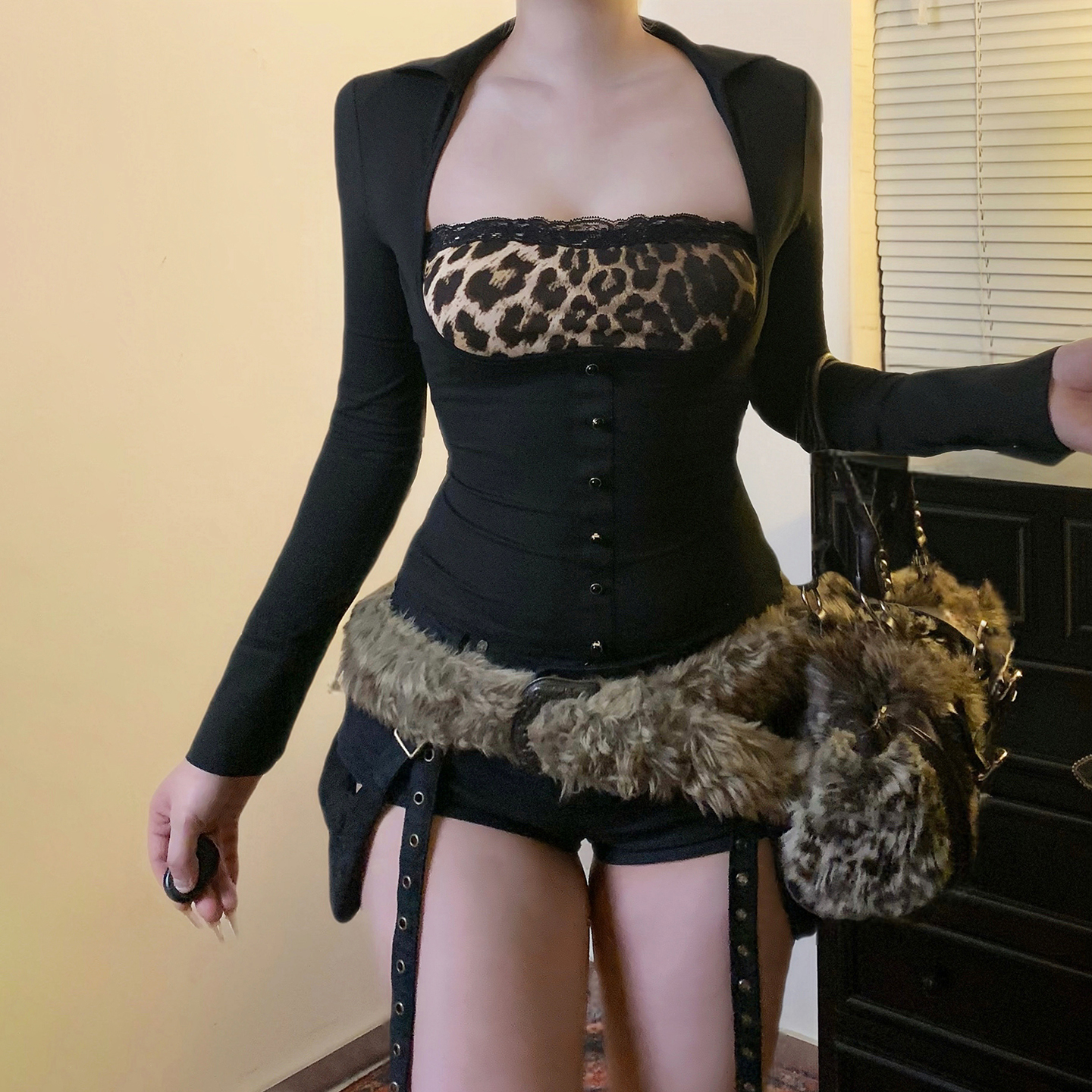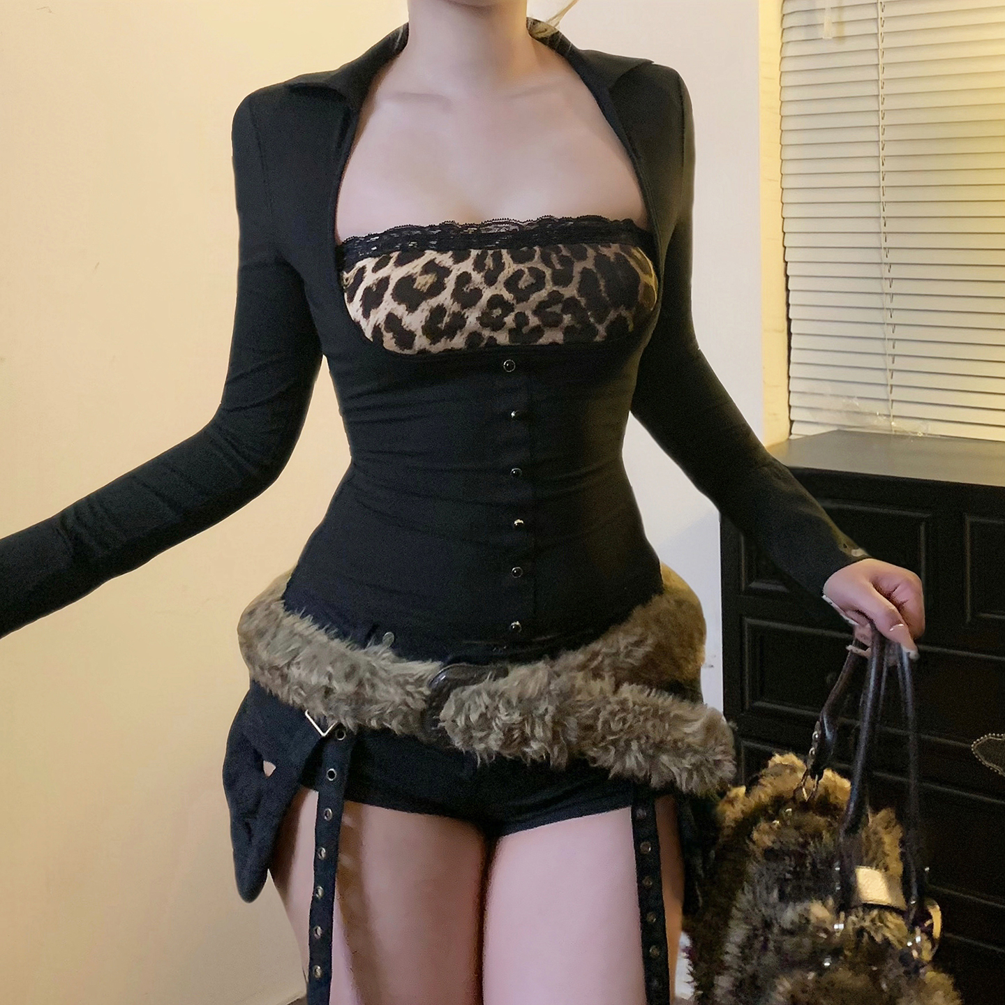 Leopard lace patchwork buckle design long sleeved T-shirt