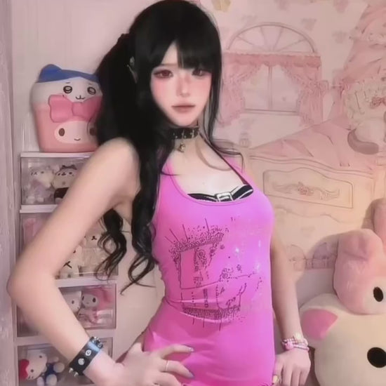 Y2K Pink Halter Rhinestone Ruffle Dress