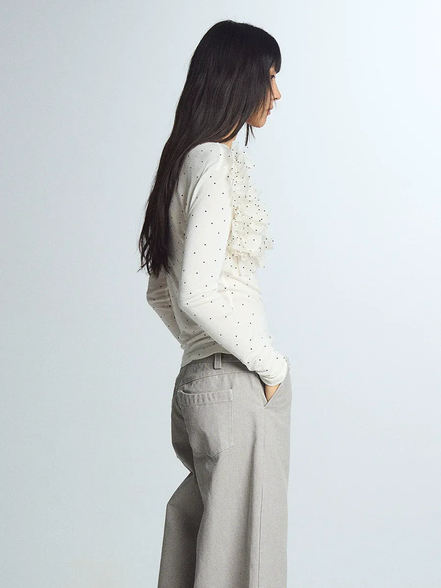 Wave dot fungus lace elastic low neck long sleeved base T-shirt