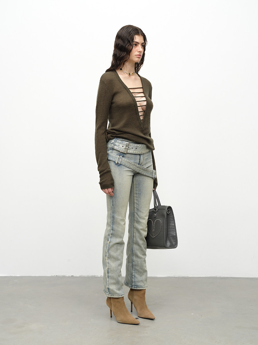 Wool hand pulled knitted pullover two-color sweater